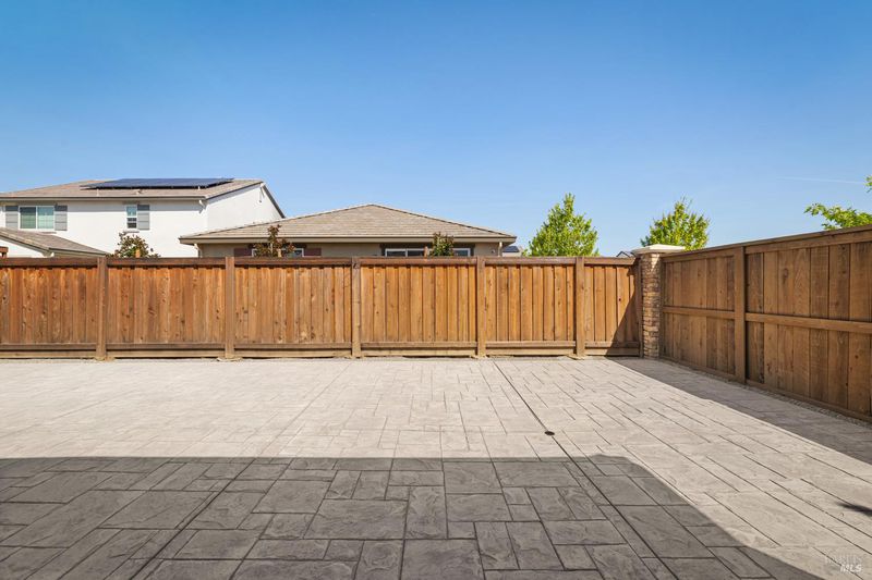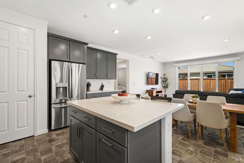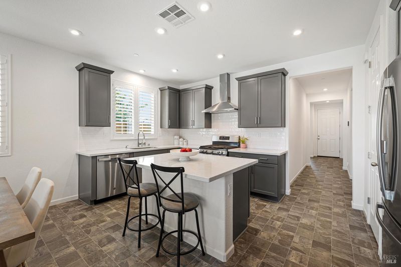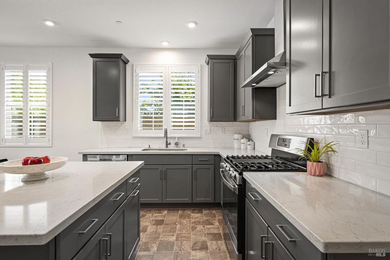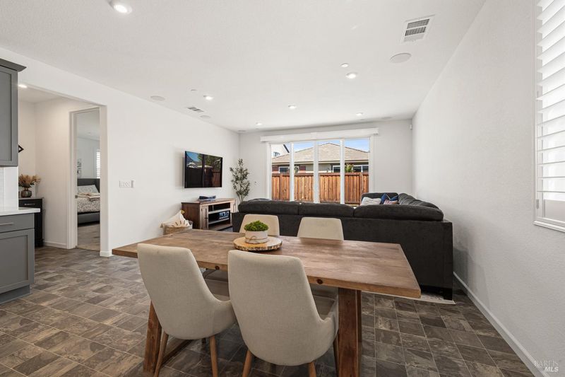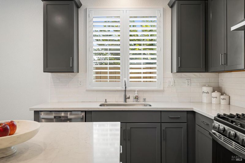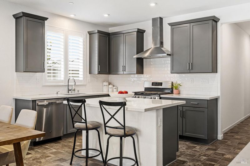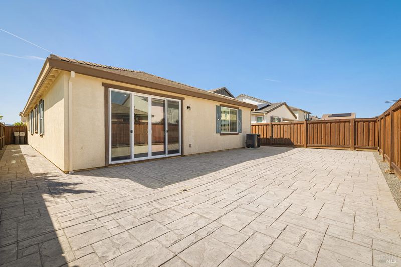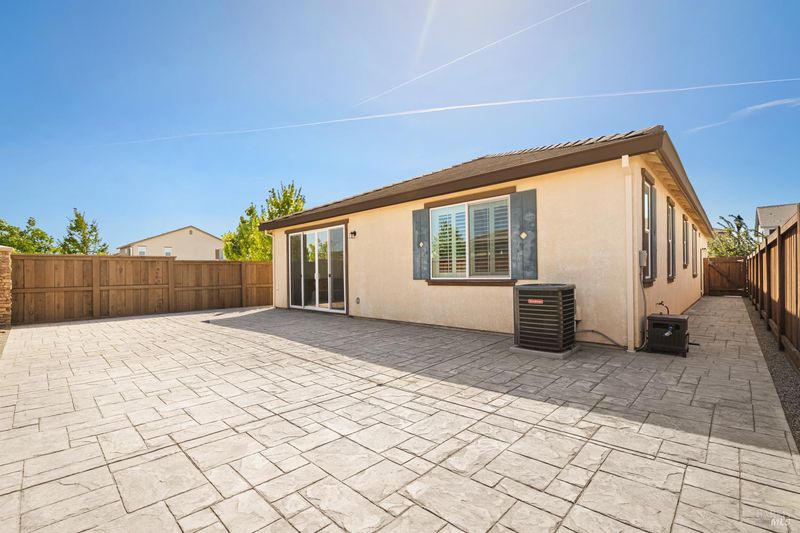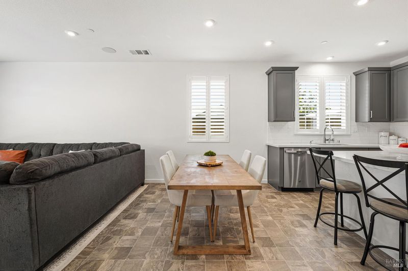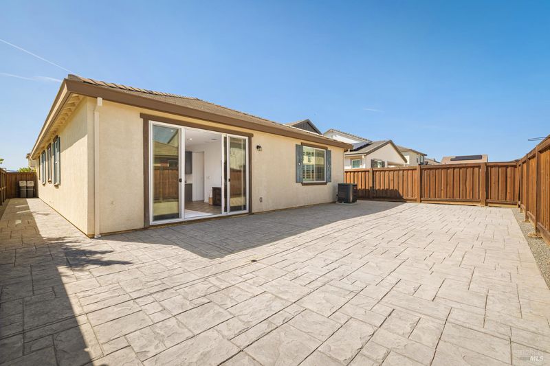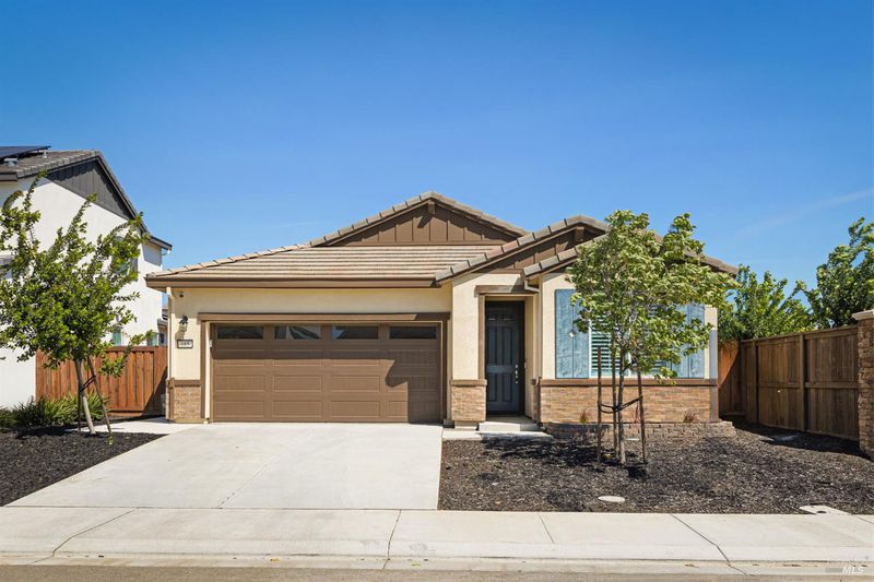 Tucked inside the desirable Homestead community in Dixon, this 2022 single-story home offers a premium corner lot setting next to a community park with no side neighbor and quick commuter-friendly I-80 access. Designed for both comfort and efficiency, it features a 3.55 kW owned outright solar system, full water softening system, and low maintenance yards that support an easy, modern lifestyle. Inside, natural light pours through white plantation shutters throughout, highlighting a bright and open concept layout where the great room, dining area, and kitchen all connect seamlessly to create a space that feels open, stylish, and inviting. At the center, the kitchen impresses with a large quartz island with bar seating, matching countertops, sleek gray shaker cabinetry, pantry closet, and a crisp white subway tile backsplash, all elevated by stainless-steel appliances including a refrigerator, dishwasher, and a gas range with an upgraded pyramid vented hood that adds a bold designer touch. A sliding glass door from the great room with motorized blinds blurs the line between indoor and outdoor living, while built-in Klipsch surround sound sets the tone for entertaining or relaxing. The primary suite feels like a private retreat with large windows overlooking the backyard and a spa-inspired bath featuring dramatic full marble Piedrafina Calcutta Blanc walls in the shower stall, matching dual sink vanity countertops, a walk-in closet with a mirrored door, separate linen storage, and modern black fixtures that complete the upscale feel. Three additional bedrooms continue the bright, cohesive design, offering flexible space for guests, family, or a home office, and share a well-appointed full bathroom with a window, shower over tub, and matching marble countertop with black finishes. The backyard is built for effortless living with a stamped concrete patio and extended side yard space, creating a clean, functional, low maintenance outdoor setting perfect for relaxing or entertaining. Everyday comfort is elevated with a laundry room featuring added cabinetry, noise-reducing insulation, plus a tankless water heater. The immaculate garage is finished with painted and epoxy flooring. Ideally located near parks, shopping, dining, and major commuter routes, this home offers the perfect blend of style, efficiency, and convenience for today's modern lifestyle.