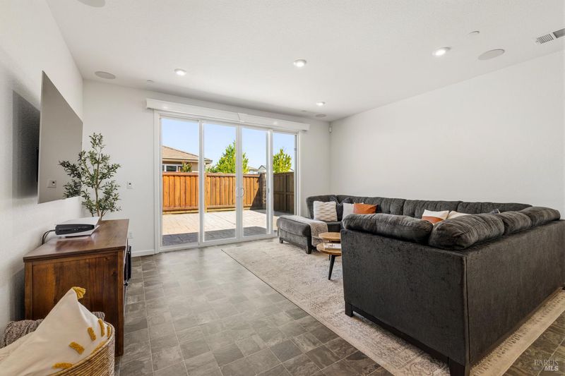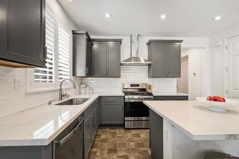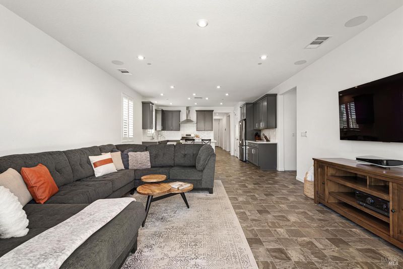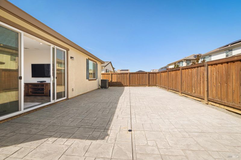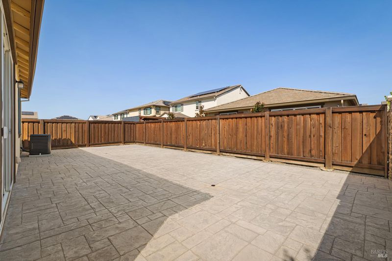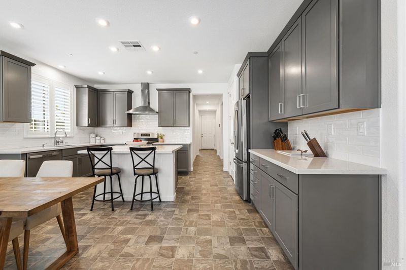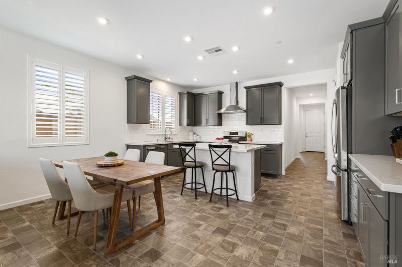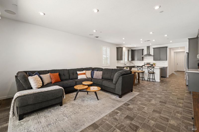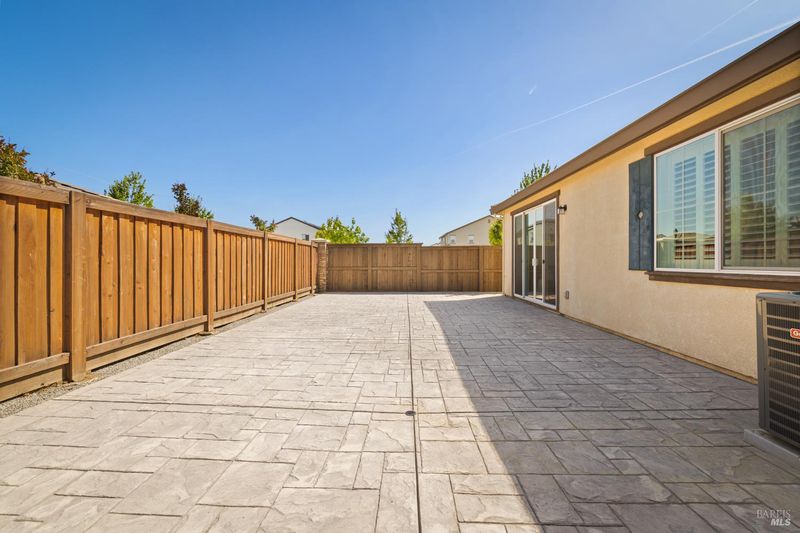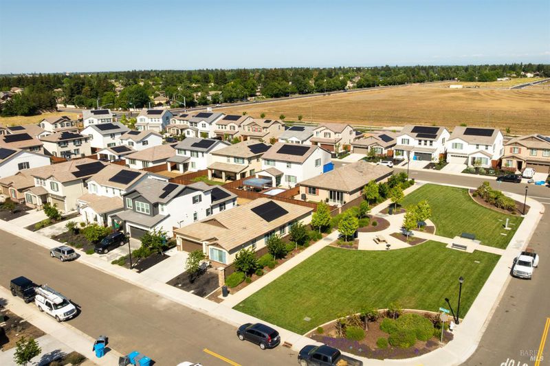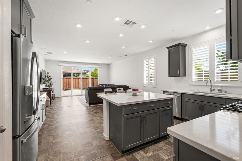 Tucked inside the desirable Homestead community in Dixon, this 2022 single-story home offers a premium corner lot setting next to a community park with no side neighbor and quick commuter-friendly I-80 access. Designed for both comfort and efficiency, it features a 3.55 kW owned outright solar system, full water softening system, and low maintenance yards that support an easy, modern lifestyle. Inside, natural light pours through white plantation shutters throughout, highlighting a bright and open concept layout where the great room, dining area, and kitchen all connect seamlessly to create a space that feels open, stylish, and inviting. At the center, the kitchen impresses with a large quartz island with bar seating, matching countertops, sleek gray shaker cabinetry, pantry closet, and a crisp white subway tile backsplash, all elevated by stainless-steel appliances including a refrigerator, dishwasher, and a gas range with an upgraded pyramid vented hood that adds a bold designer touch. A sliding glass door from the great room with motorized blinds blurs the line between indoor and outdoor living, while built-in Klipsch surround sound sets the tone for entertaining or relaxing. The primary suite feels like a private retreat with large windows overlooking the backyard and a spa-inspired bath featuring dramatic full marble Piedrafina Calcutta Blanc walls in the shower stall, matching dual sink vanity countertops, a walk-in closet with a mirrored door, separate linen storage, and modern black fixtures that complete the upscale feel. Three additional bedrooms continue the bright, cohesive design, offering flexible space for guests, family, or a home office, and share a well-appointed full bathroom with a window, shower over tub, and matching marble countertop with black finishes. The backyard is built for effortless living with a stamped concrete patio and extended side yard space, creating a clean, functional, low maintenance outdoor setting perfect for relaxing or entertaining. Everyday comfort is elevated with a laundry room featuring added cabinetry, noise-reducing insulation, plus a tankless water heater. The immaculate garage is finished with painted and epoxy flooring. Ideally located near parks, shopping, dining, and major commuter routes, this home offers the perfect blend of style, efficiency, and convenience for today's modern lifestyle.