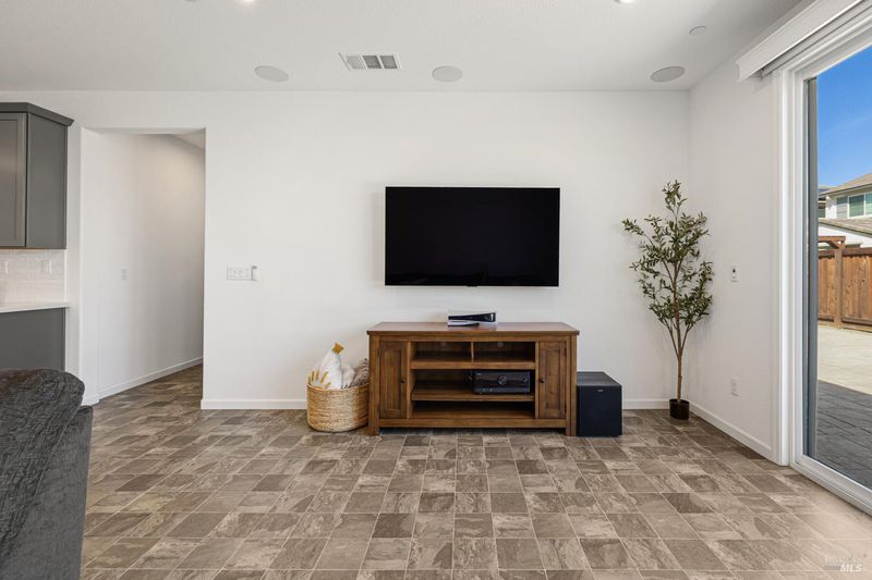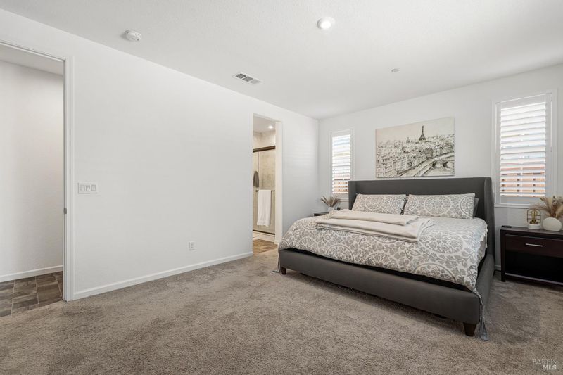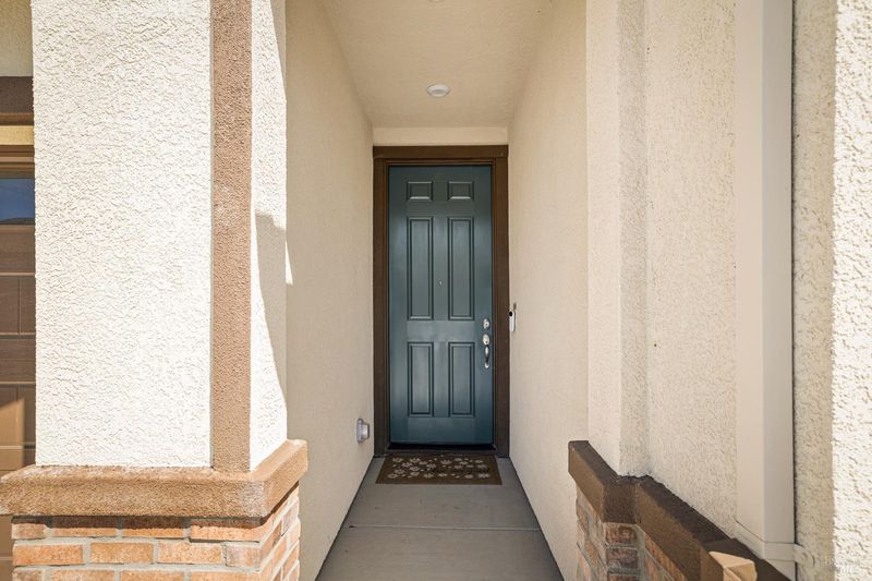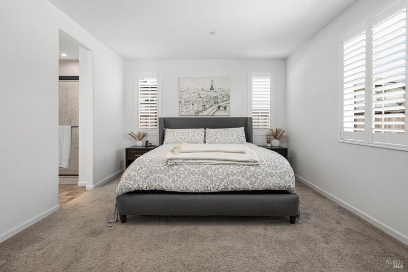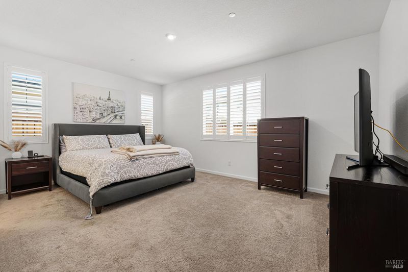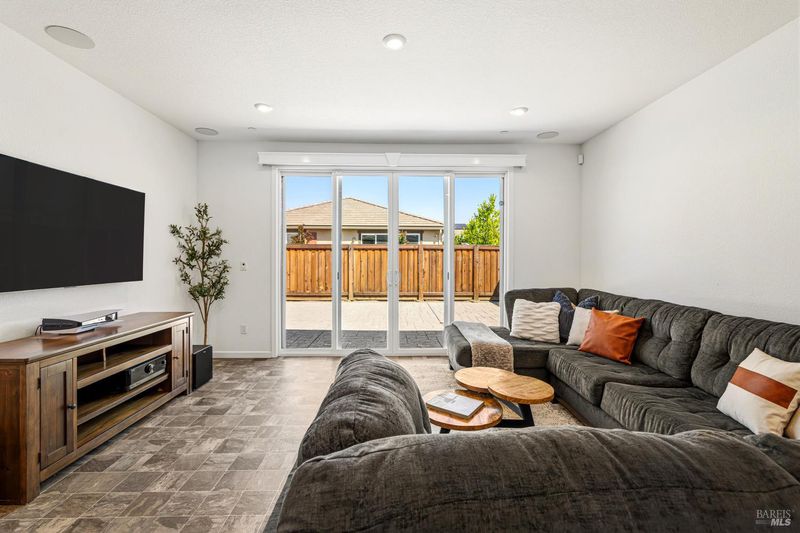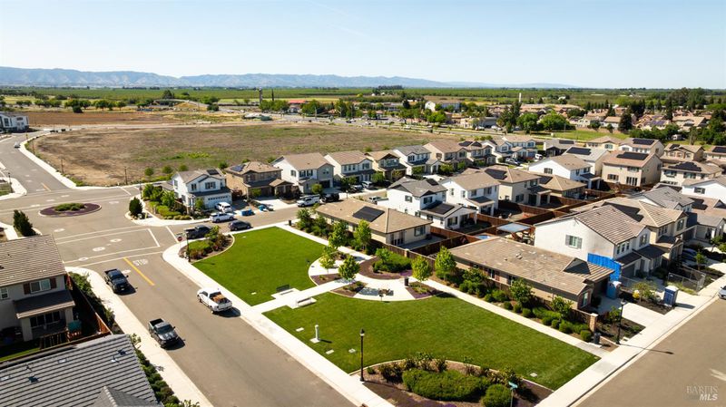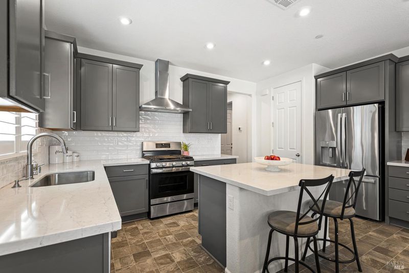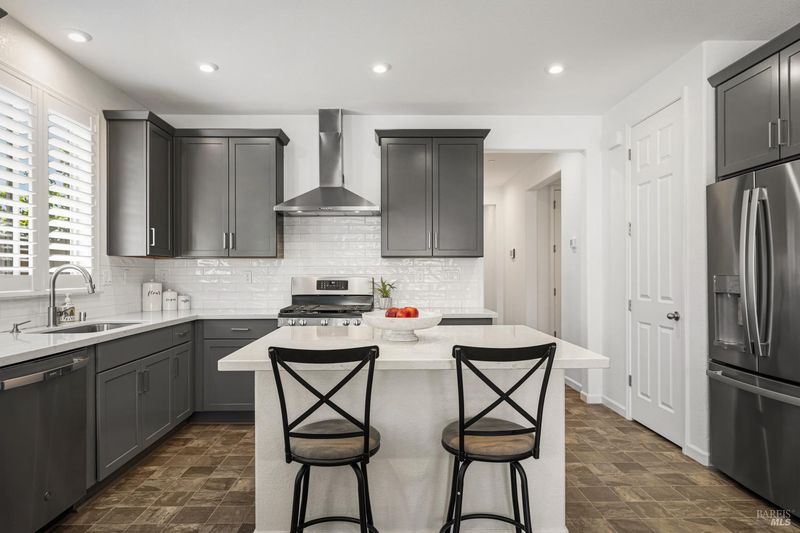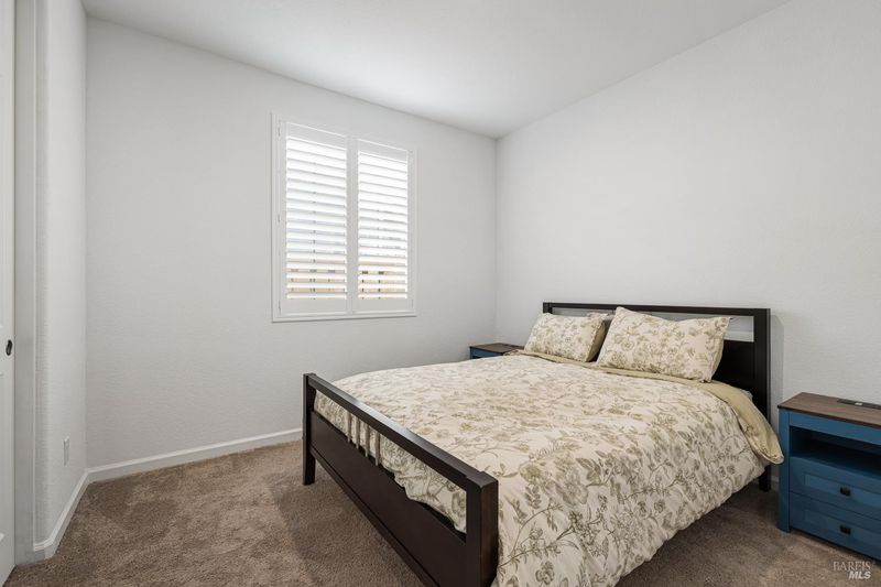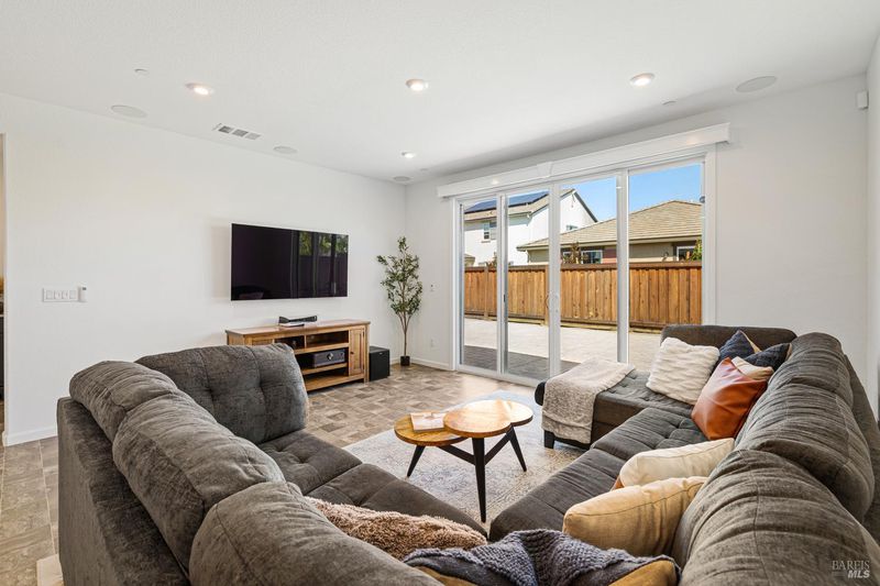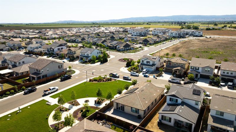 Tucked inside the desirable Homestead community in Dixon, this 2022 single-story home offers a premium corner lot setting next to a community park with no side neighbor and quick commuter-friendly I-80 access. Designed for both comfort and efficiency, it features a 3.55 kW owned outright solar system, full water softening system, and low maintenance yards that support an easy, modern lifestyle. Inside, natural light pours through white plantation shutters throughout, highlighting a bright and open concept layout where the great room, dining area, and kitchen all connect seamlessly to create a space that feels open, stylish, and inviting. At the center, the kitchen impresses with a large quartz island with bar seating, matching countertops, sleek gray shaker cabinetry, pantry closet, and a crisp white subway tile backsplash, all elevated by stainless-steel appliances including a refrigerator, dishwasher, and a gas range with an upgraded pyramid vented hood that adds a bold designer touch. A sliding glass door from the great room with motorized blinds blurs the line between indoor and outdoor living, while built-in Klipsch surround sound sets the tone for entertaining or relaxing. The primary suite feels like a private retreat with large windows overlooking the backyard and a spa-inspired bath featuring dramatic full marble Piedrafina Calcutta Blanc walls in the shower stall, matching dual sink vanity countertops, a walk-in closet with a mirrored door, separate linen storage, and modern black fixtures that complete the upscale feel. Three additional bedrooms continue the bright, cohesive design, offering flexible space for guests, family, or a home office, and share a well-appointed full bathroom with a window, shower over tub, and matching marble countertop with black finishes. The backyard is built for effortless living with a stamped concrete patio and extended side yard space, creating a clean, functional, low maintenance outdoor setting perfect for relaxing or entertaining. Everyday comfort is elevated with a laundry room featuring added cabinetry, noise-reducing insulation, plus a tankless water heater. The immaculate garage is finished with painted and epoxy flooring. Ideally located near parks, shopping, dining, and major commuter routes, this home offers the perfect blend of style, efficiency, and convenience for today's modern lifestyle.
