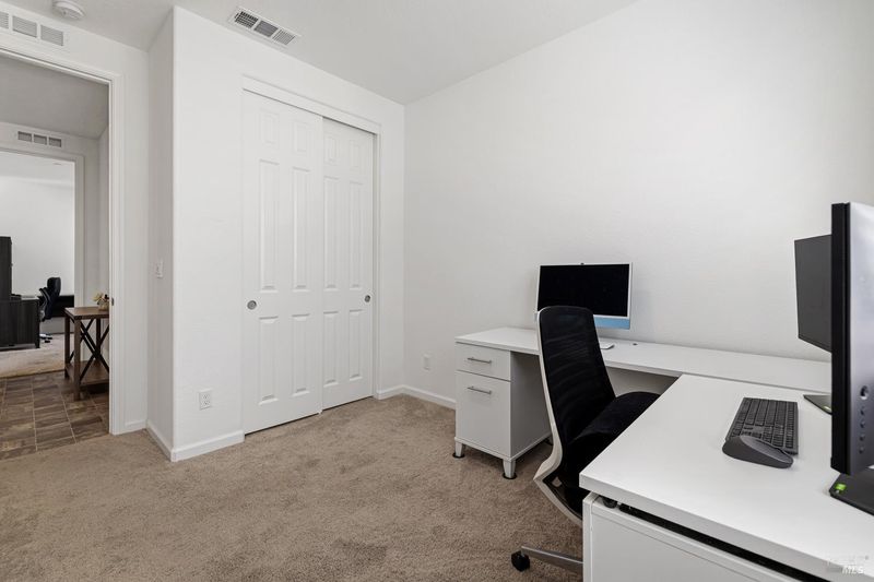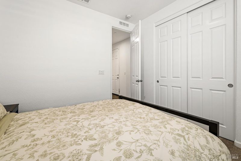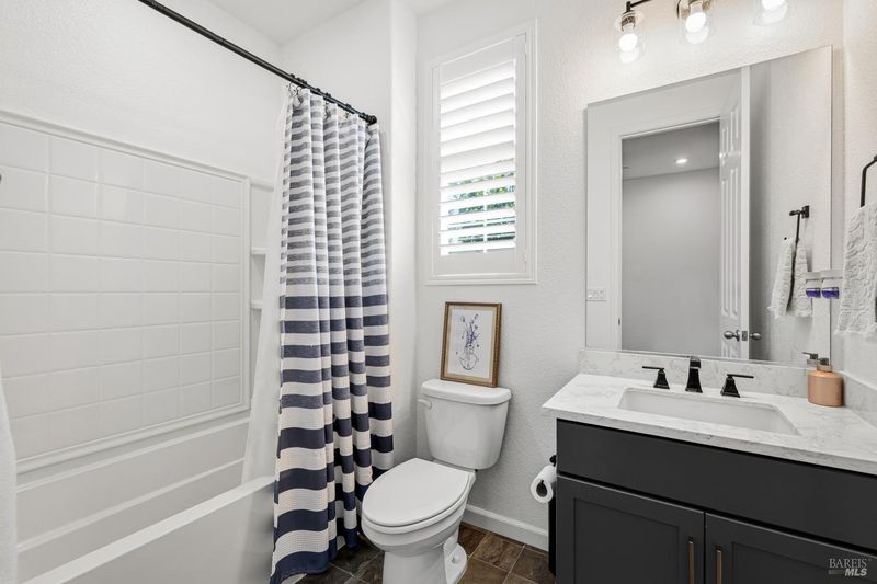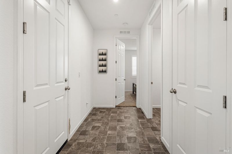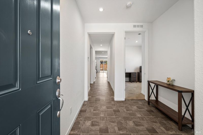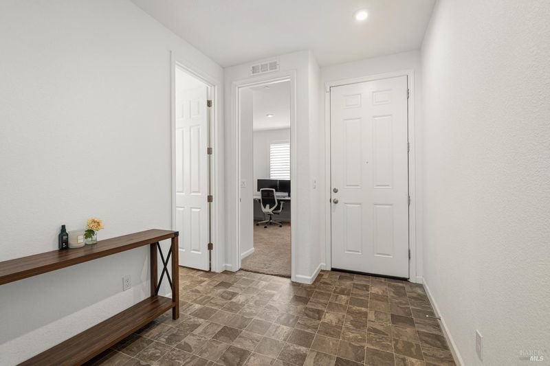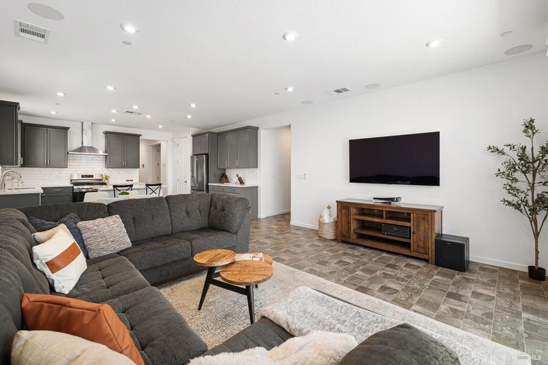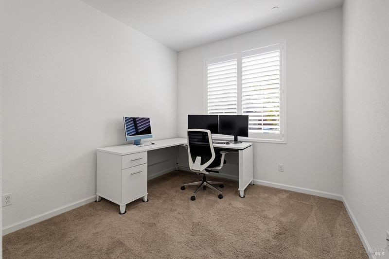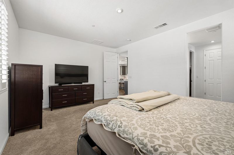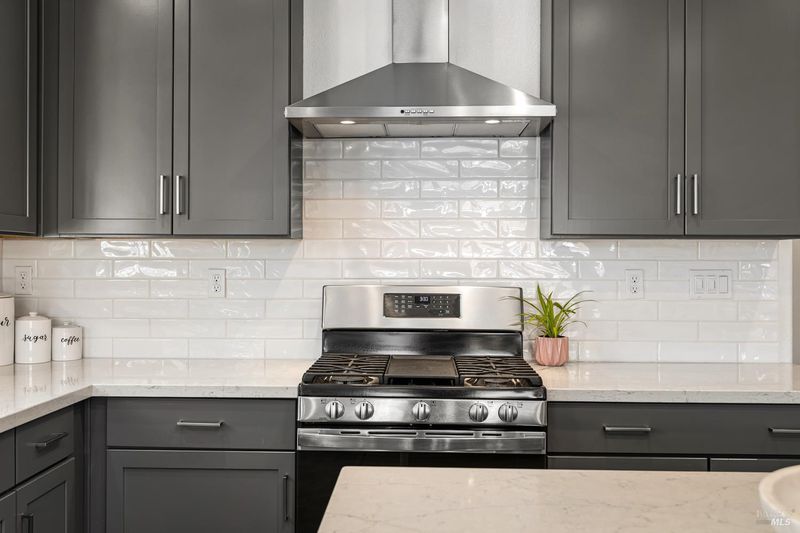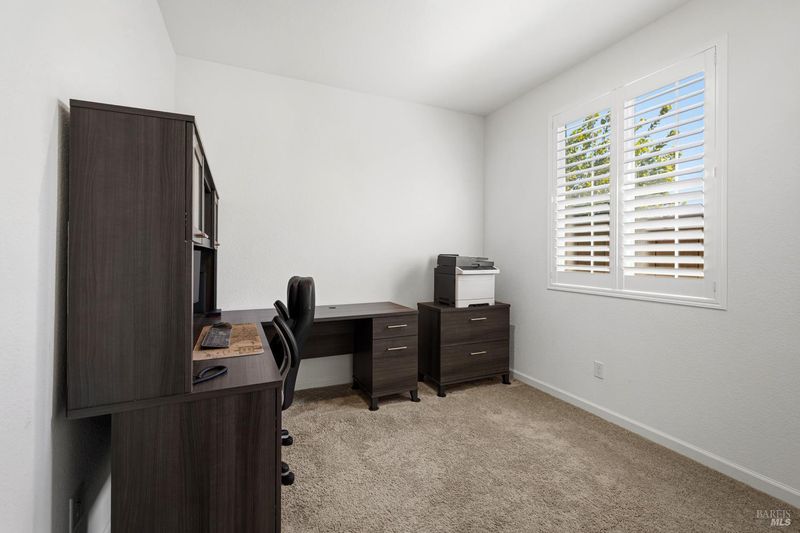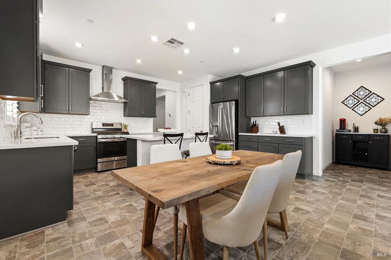 Tucked inside the desirable Homestead community in Dixon, this 2022 single-story home offers a premium corner lot setting next to a community park with no side neighbor and quick commuter-friendly I-80 access. Designed for both comfort and efficiency, it features a 3.55 kW owned outright solar system, full water softening system, and low maintenance yards that support an easy, modern lifestyle. Inside, natural light pours through white plantation shutters throughout, highlighting a bright and open concept layout where the great room, dining area, and kitchen all connect seamlessly to create a space that feels open, stylish, and inviting. At the center, the kitchen impresses with a large quartz island with bar seating, matching countertops, sleek gray shaker cabinetry, pantry closet, and a crisp white subway tile backsplash, all elevated by stainless-steel appliances including a refrigerator, dishwasher, and a gas range with an upgraded pyramid vented hood that adds a bold designer touch. A sliding glass door from the great room with motorized blinds blurs the line between indoor and outdoor living, while built-in Klipsch surround sound sets the tone for entertaining or relaxing. The primary suite feels like a private retreat with large windows overlooking the backyard and a spa-inspired bath featuring dramatic full marble Piedrafina Calcutta Blanc walls in the shower stall, matching dual sink vanity countertops, a walk-in closet with a mirrored door, separate linen storage, and modern black fixtures that complete the upscale feel. Three additional bedrooms continue the bright, cohesive design, offering flexible space for guests, family, or a home office, and share a well-appointed full bathroom with a window, shower over tub, and matching marble countertop with black finishes. The backyard is built for effortless living with a stamped concrete patio and extended side yard space, creating a clean, functional, low maintenance outdoor setting perfect for relaxing or entertaining. Everyday comfort is elevated with a laundry room featuring added cabinetry, noise-reducing insulation, plus a tankless water heater. The immaculate garage is finished with painted and epoxy flooring. Ideally located near parks, shopping, dining, and major commuter routes, this home offers the perfect blend of style, efficiency, and convenience for today's modern lifestyle.
