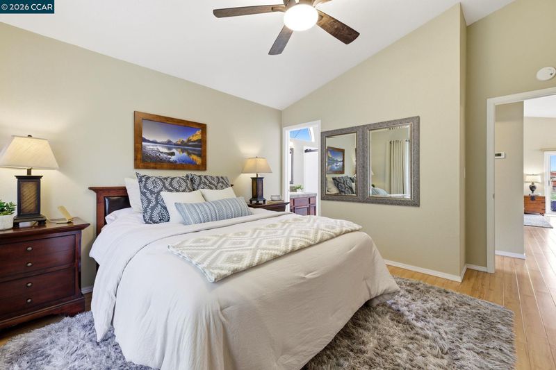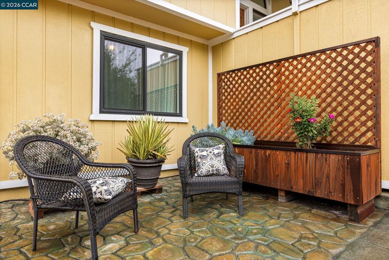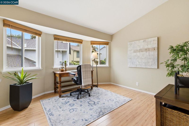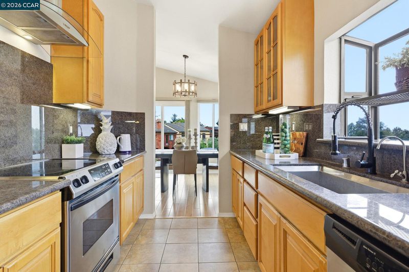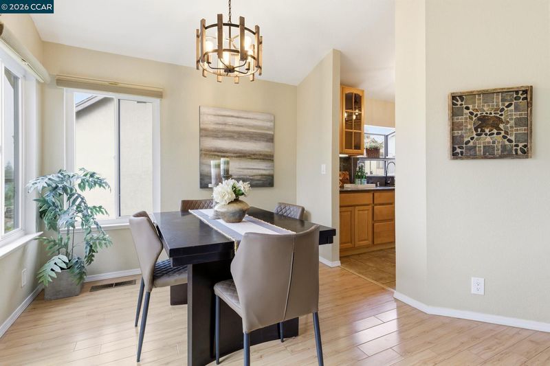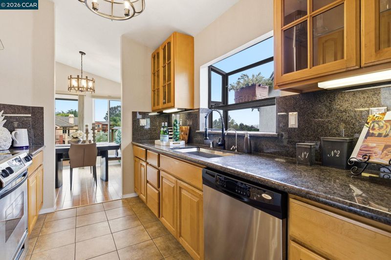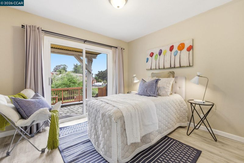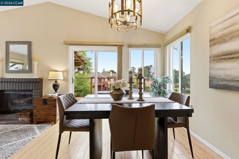 End-of-cul-de-sac setting in the Fairview area with privacy, open surroundings and views of Mission Hills, eucalyptus and a distant glimpse toward the Bay. Backing to open land with a pastoral backdrop, often dotted with grazing sheep, the setting feels unexpectedly removed while still close to everyday conveniences. The layout is designed for flexibility across two levels, with the main living spaces positioned upstairs to maximize natural light and connection to the surrounding setting. Vaulted ceilings and large windows create an open, airy feel, while the living room centers around a fireplace and opens directly to an expansive balcony that captures the surrounding views, ideal for outdoor dining, relaxing or unwinding at the end of the day. The dining area connects seamlessly to the updated kitchen, featuring granite countertops, stainless steel appliances, ample cabinetry and a functional layout that supports both daily use and hosting. A separate room off the kitchen offers versatility for a home offic