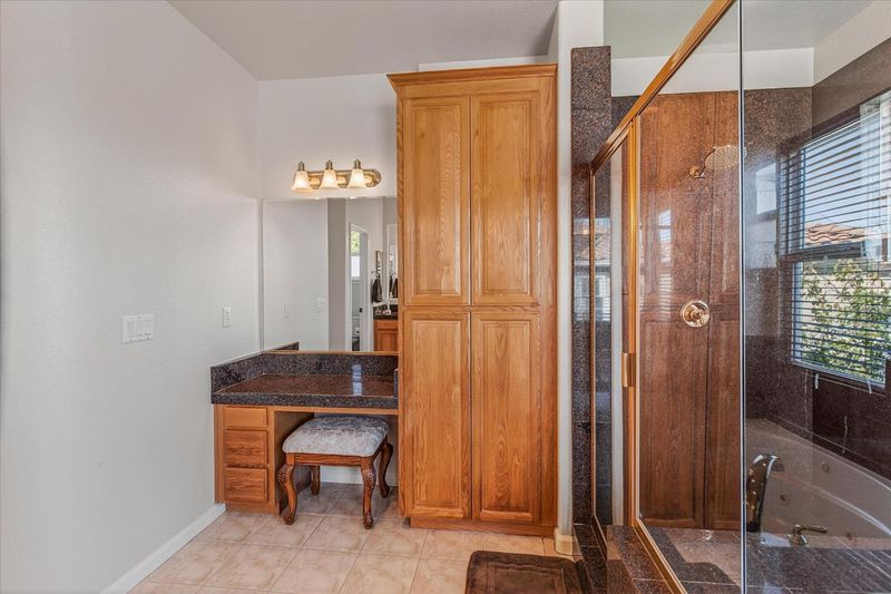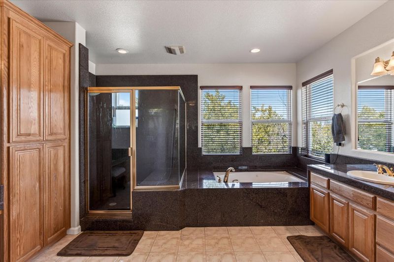 - Double Sinks, Granite, Pass Through, Stall Shower, Shower and Tub, Tile, Tub with Jets, Updated Bath