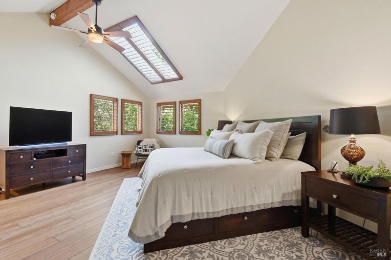 Tucked within the coveted Fairway View Estates, this beautifully crafted residence offers a rare blend of refined comfort and scenic wine country living. Inspired by the charm of a Tahoe retreat, the home features dramatic wood beam ceilings and an open, airy layout that lives like single-level.