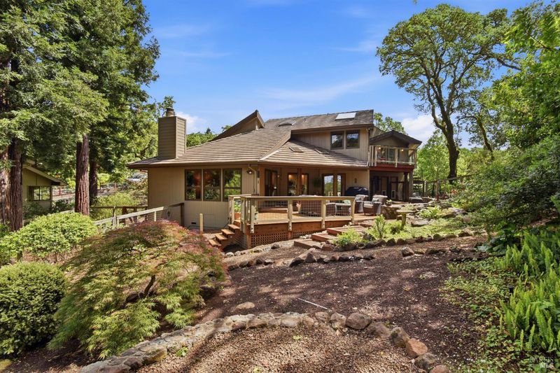 Tucked within the coveted Fairway View Estates, this beautifully crafted residence offers a rare blend of refined comfort and scenic wine country living. Inspired by the charm of a Tahoe retreat, the home features dramatic wood ceilings and an open, airy layout that lives like single-level. At the heart of the home, the well-appointed kitchen impresses with granite surfaces, premium stainless steel appliances, a 5-burner gas cooktop, convection oven, and abundant pantry storage perfect for both casual meals and entertaining. The private upstairs primary suite feels like a peaceful escape, showcasing stylish flooring and vanity, a spacious custom closet, and a balcony where sweeping views set the tone for quiet mornings or sunset evenings. A graceful curved staircase adds architectural flair, while an adjacent flex space is ideal for a home office. This home features two additional generously sized bedrooms and large windows throughout the home invite in natural light and stunning vistas. Outside, the property truly shines with a tranquil backyard that opens to natural space, complete with a low-maintenance landscape, a calming pond and waterfall, and a view deck made for gathering or unwinding. Thoughtfully maintained with quality features such as wood-framed windows, updated HVAC, tile roof, and a spacious laundry room with built-ins, this home is as practical as it is beautiful. With ample space for a pool or possible ADU, this is a rare opportunity to own a slice of wine country paradise in a prime location close to outdoor recreation, golf, and everyday conveniences.