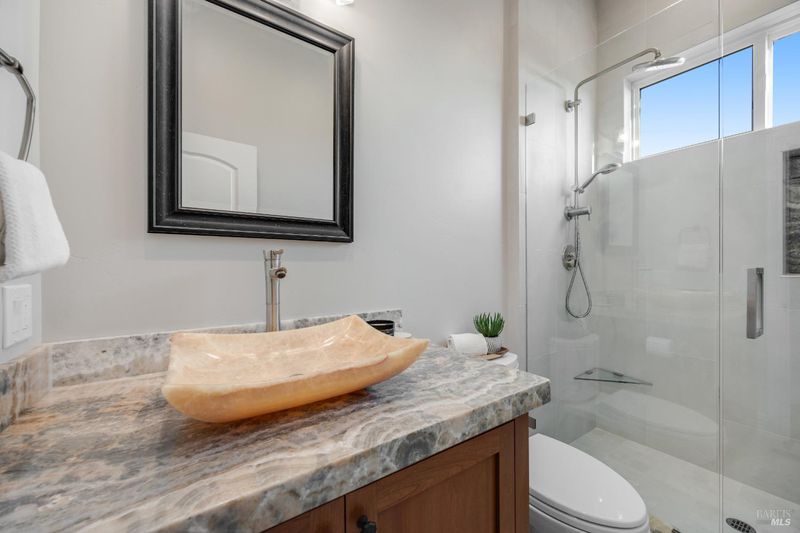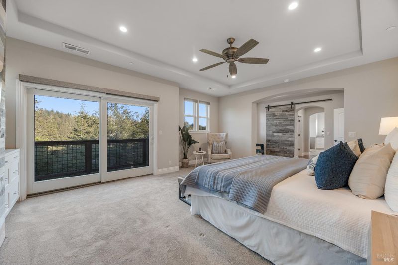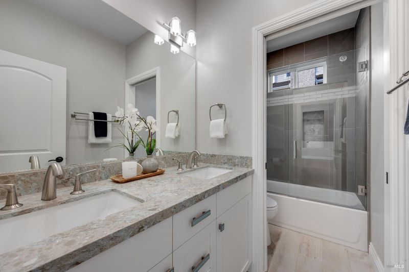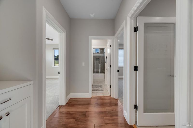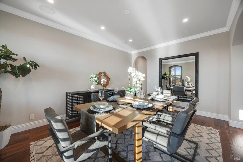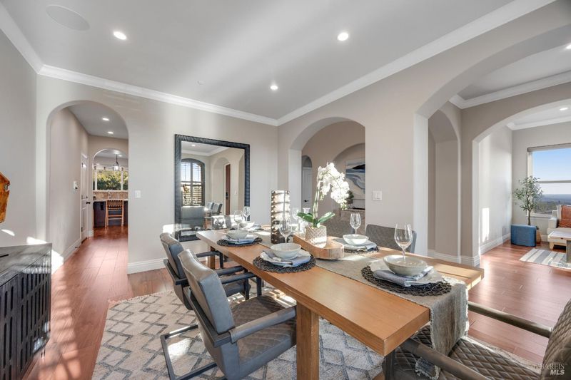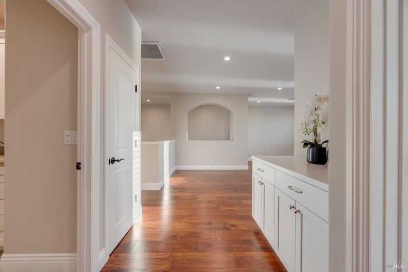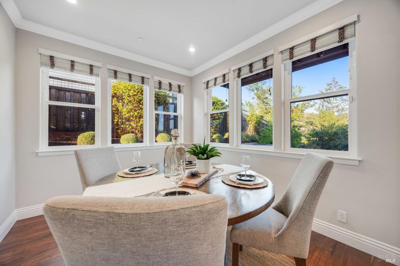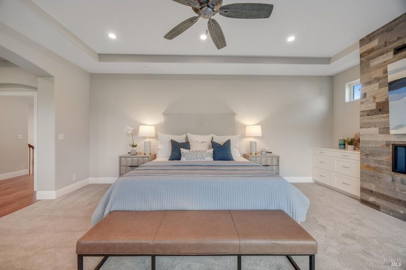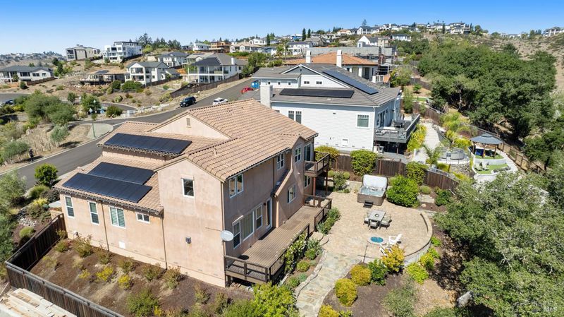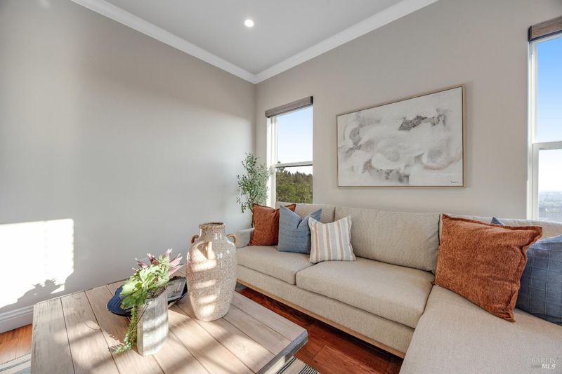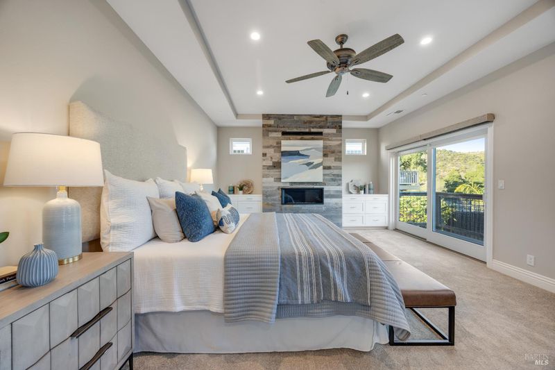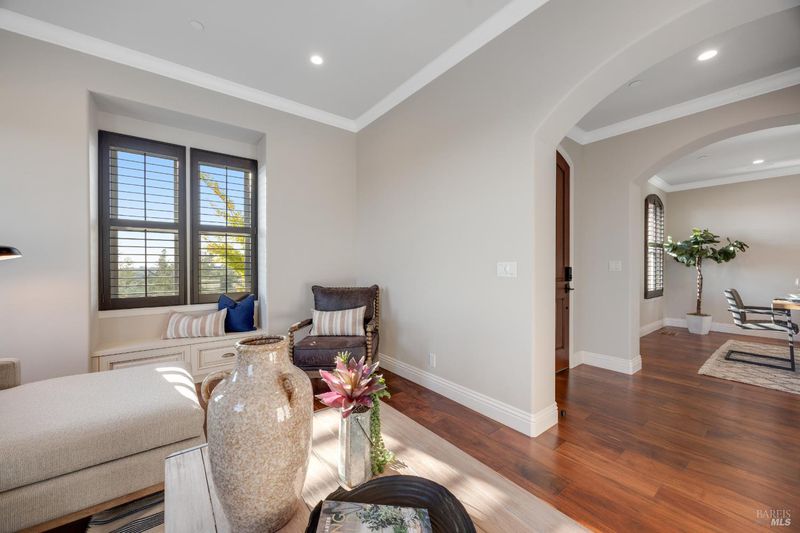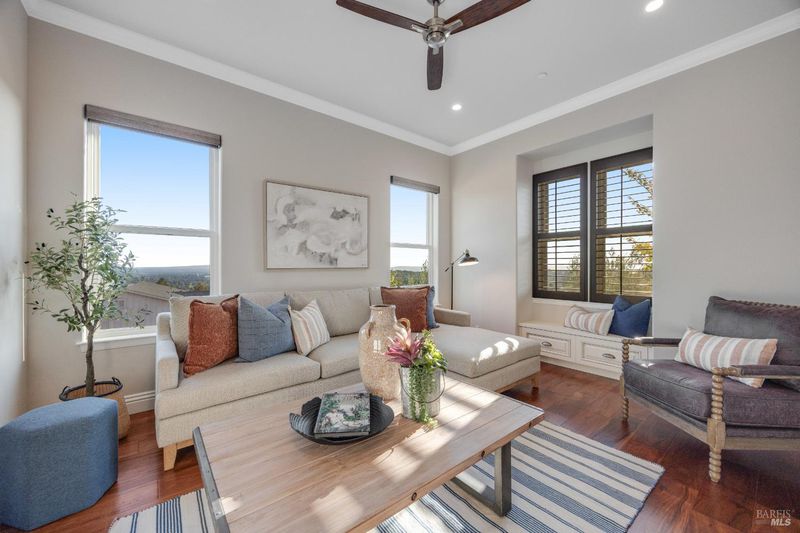 This modern, luxurious Fountaingrove gem blends elegance, comfort, and functionality across 3,818 sq. ft. of meticulously designed living space. Nestled on a generous 0.41-acre lot, this 4-bedroom, 3-bath home features a spacious loft, tile roof, and a 4-car tandem garage perfect for today's lifestyle. Step through the impressive entry to find crown molding and rich Acacia wood floors flowing throughout the main living spaces, setting a tone of warmth and sophistication. The formal dining room invites effortless entertaining, while the serene living room provides a peaceful retreat with tranquil views. The expansive great room centers around a stunning gas fireplace framed by custom built-ins and surround sound, seamlessly opening to the chef's kitchen. Culinary enthusiasts will love the granite countertops, soft-close cabinetry, pendant-lit island, Wolf double ovens and range, Sub-Zero refrigerator, KitchenAid dishwasher, and butler's pantry with wine storage plus a walk-in pantry with decorative glass door. The luxurious primary suite offers a private sanctuary featuring a cozy gas fireplace, coffered ceilings, dual walk-in closets, custom built-ins, private deck, spa-like bath with soaking tub, glass shower, and dual granite vanities. A dramatic staircase leads to the versatile upstairs loft, ideal for a media room, home office, or play space. Additional amenities include upstairs laundry, central heat/air, soft water system, owned solar, alarm system, and a whole-home Generac generator for ultimate peace of mind. Step outside to beautifully landscaped grounds with a paver patio, gas firepit, flagstone pathways, and a relaxing luxury spa all backed by open space for added privacy. A rare opportunity to experience elevated Fountaingrove living refreshed, refined, and ready to welcome you home.