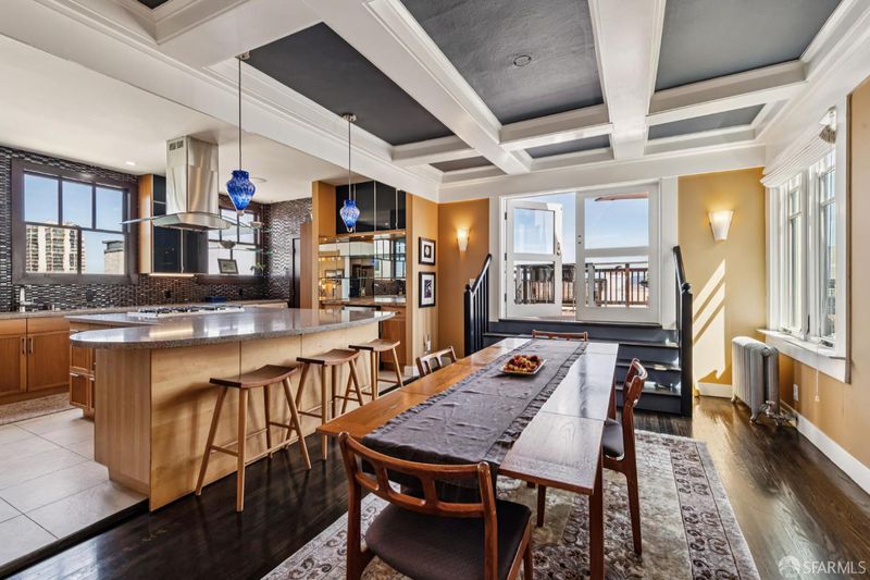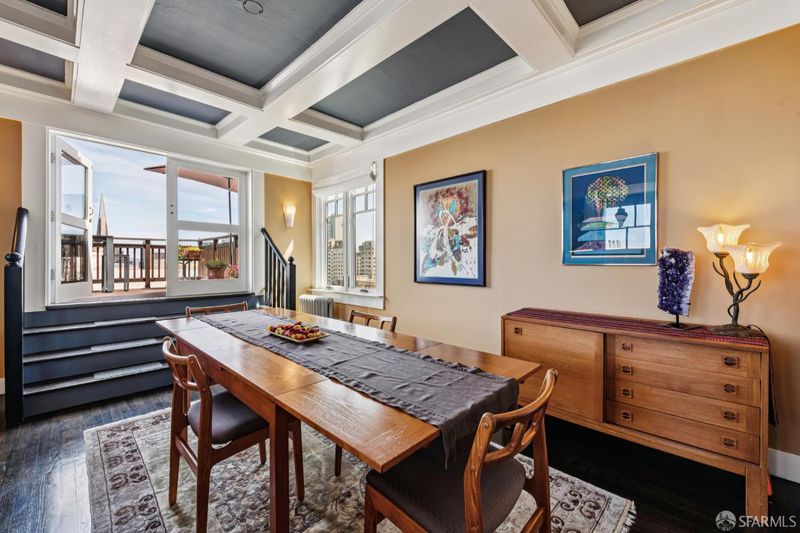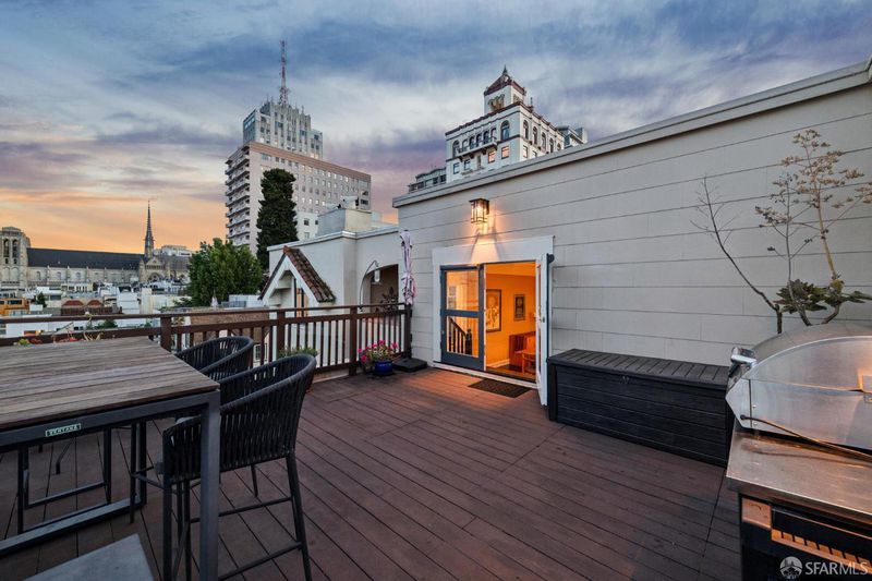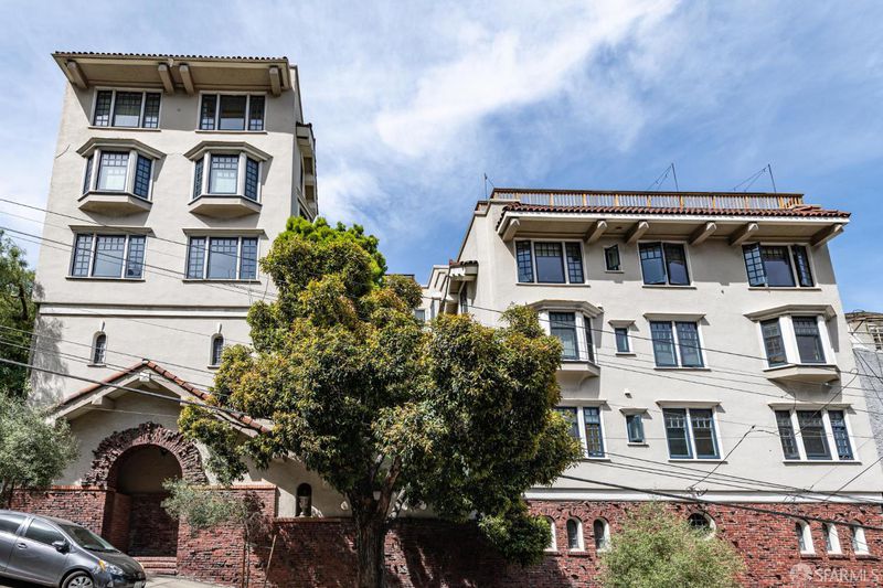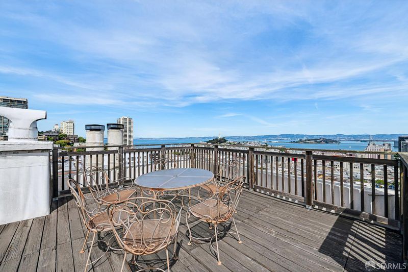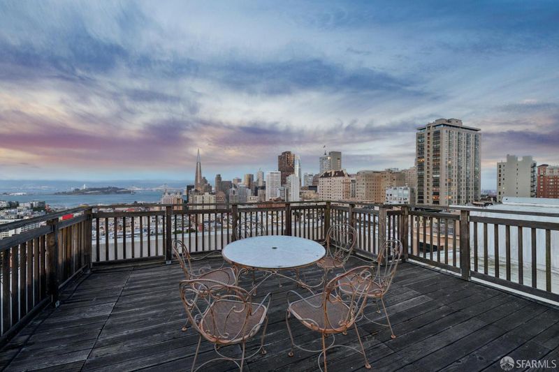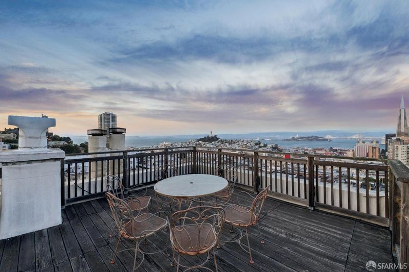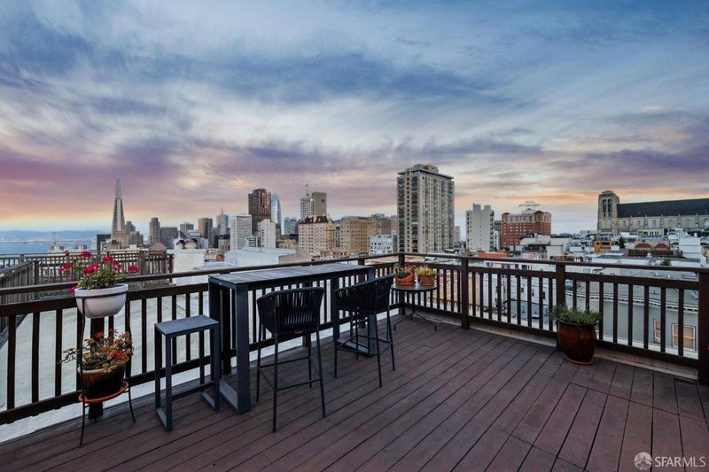 Top-floor renovated Nob Hill penthouse in a classic Spanish Mediterranean building with iconic SF views. 3BD/2BA condo features a spacious living room with a black granite wood-burning fireplace, an open kitchen with premium appliances and a custom bar, a dining area that flows directly to the large view deck. Enjoy sweeping panoramas of the Bay, downtown skyline, Transamerica Pyramid, Coit Tower, Bay Bridge, and Grace Cathedral from the main living areas and private deck. Amenities include an additional shared roof deck, in-unit laundry, storage, and an exceptional Nob Hill location.
