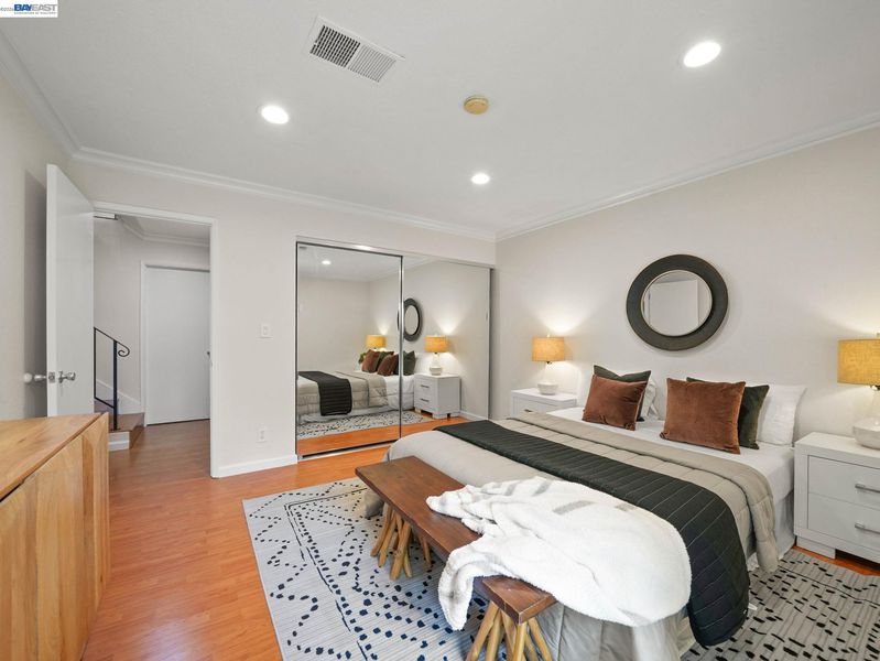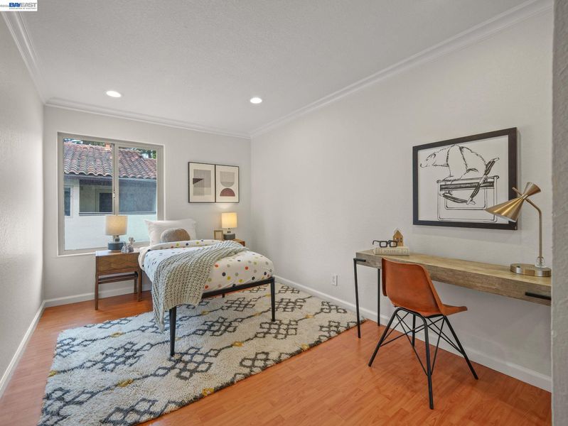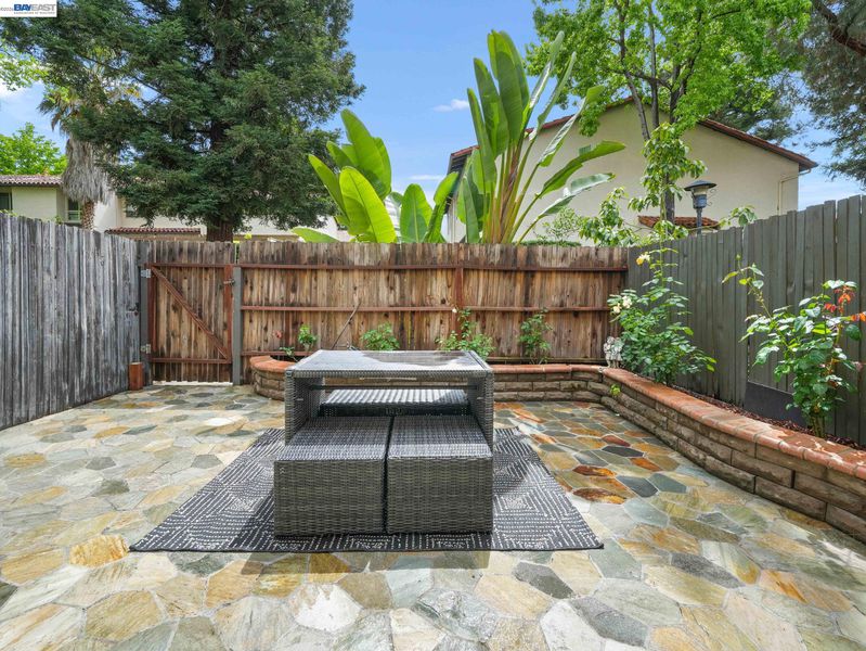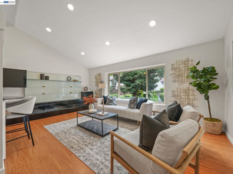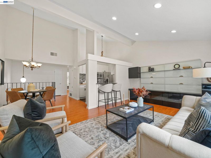 This beautifully updated 3-bed, 2-bath townhome in the desirable Mission West neighborhood of Mission Fremont. The home features an open living room with vaulted ceilings and large windows, creating a bright, airy atmosphere. The updated kitchen boasts new quartz countertops, a glass tile backsplash, painted cabinets, a new stove, sink, and faucet. Upstairs, two spacious bedrooms with mirrored closets and a renovated hall bath with tile flooring, a new sink, a quartz countertop, and fixtures. A private downstairs bedroom with a sliding door leads to the front yard, and a full bathroom with granite countertops and a glass shower enclosure. Other highlights include laminate flooring throughout, recessed lighting, fresh interior paint, a 2-car garage with EV charging, and in-unit washer & dryer. Enjoy a private front yard and a location within walking distance of top-rated schools, Gomes Elementary, Hopkins Jr., and Mission High School (check w/FUSD). With easy access to Lake Elizabeth Park, BART station, 680 & 880. This townhome offers both comfort and convenience.