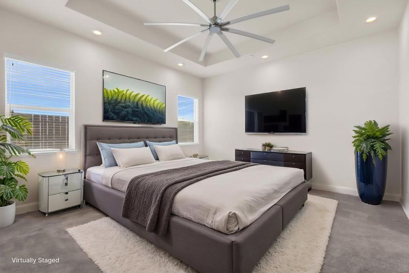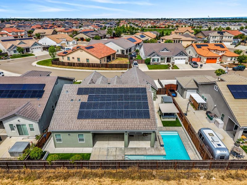 New listing in The Solera Collection! Crafted by Atherton Homes Phase #3 Patagonia Model, this elegantly appointed four-bedroom, 4-bathroom residence offers 2,718 square feet on a generous lot with RV parking in one of Manteca's most sought-after neighborhoods in RIPON school district. Inside, dramatic 12-13-foot coffered ceilings, a light-filled open floor plan, and refined finishes create an elevated sense of space for both everyday living and polished entertaining. Every detail feels curated, yet wonderfully livable. The kitchen and great room extend effortlessly to a resort-caliber backyard with an in-ground Gunite saltwater pool with lighting, an outdoor barbecue island with television, a gas fire pit, and a Tough Shed for discreet storage. OWNED SOLAR system, central heating & Air, a tankless water heater, Whole house fan, water filter & softener system, smart security flood lights with Ring cameras, and a (3) three-car garage with insulated doors enhance comfort and convenience. Moments from shopping at Walmart Supercenter and recreation at Great Wolf Lodge, this exceptional home delivers luxury with ease. Come experience this remarkable home in person and schedule your private tour today.