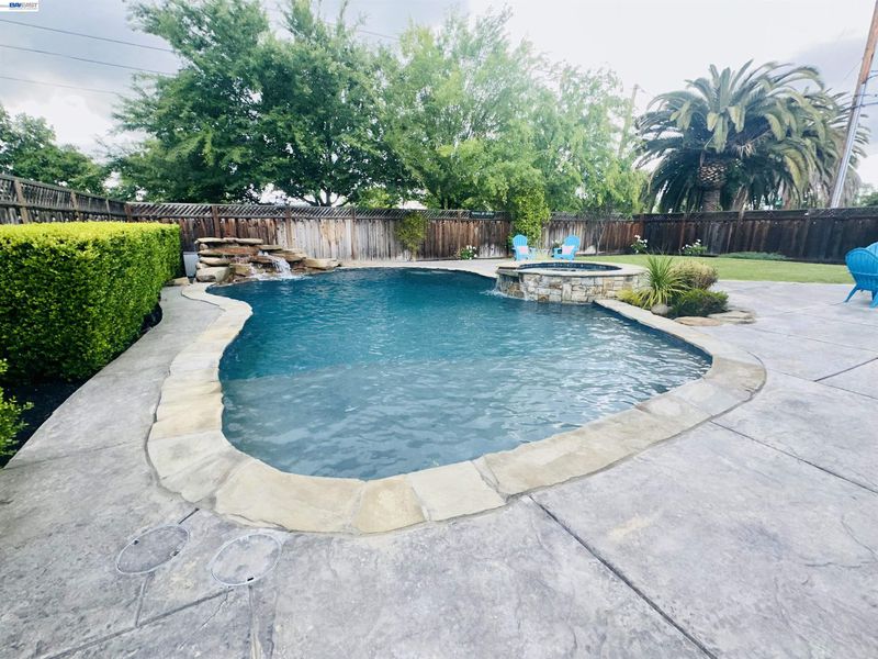 Front door and entrance located on Pleasant View Lane! Your 2015 custom home retreat awaits with 4 bedrooms plus office and HUGE backyard! This residence offers modern sophistication and comfortable living throughout. A stunning paver driveway sets the tone for the elegance inside. Step onto beautiful hardwood flooring that flows throughout the entire home, complemented by soaring ceilings and a unique open-concept floor plan, perfect for everyday living and entertaining. The expansive family room features custom built-in shelving and cabinetry along with a striking gas fireplace that creates a warm, inviting focal point. A downstairs bedroom and a full bathroom provide ideal space for guests or multigenerational living. Enjoy the wine station adding the perfect Wine Country touch. The chef’s kitchen is designed to impress with a large island, walk-in pantry, Thermador refrigerator, six-burner gas range, and two ovens perfect for preparing meals and hosting gatherings. Upstairs you’ll find a spacious laundry room, office room, two large secondary bedrooms, and a luxurious primary retreat with an oversized walk-in closet and spa-inspired bathroom. The resort-like backyard is a true oasis with large pool, waterfalls, hot tub, covered patio and U-shape outdoor kitchen. Over $200,000 in upgrades and backyard features. Live your best life in this incredible home just minutes to downtown, wineries and adventure!