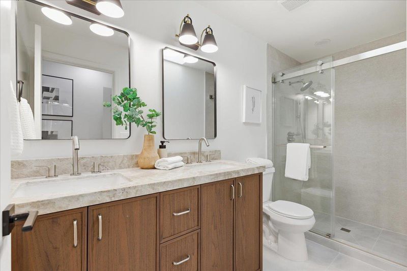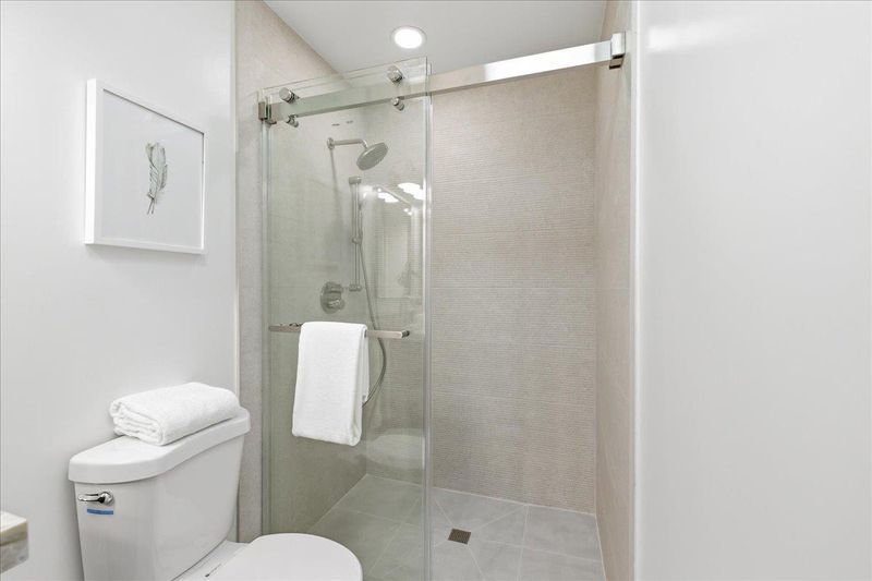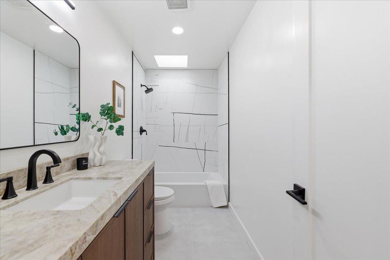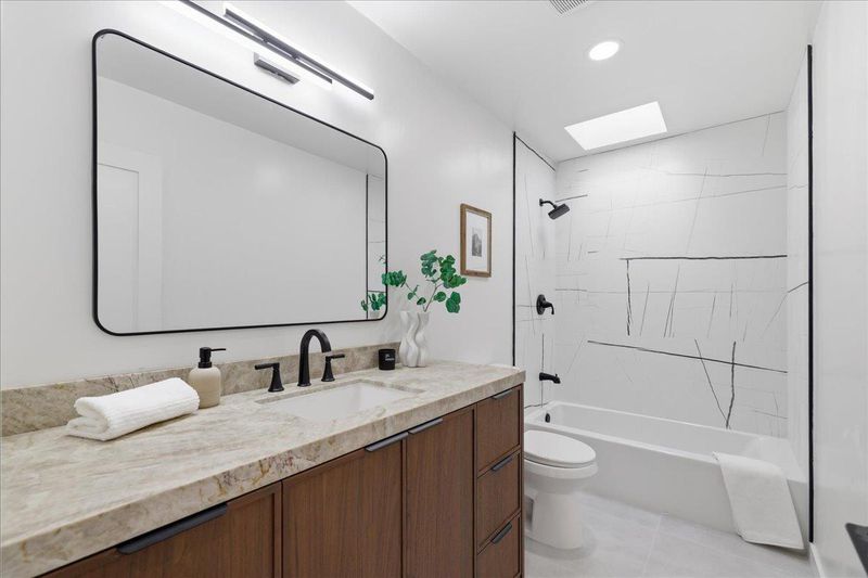 Double Sinks, Full on Ground Floor, Primary - Stall Shower(s), Shower over Tub - 1, Skylight, Tile, Tub, Updated Bath
