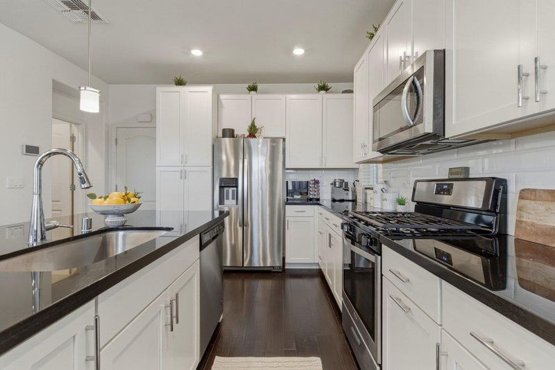 - Cooktop - Gas, Dishwasher, Exhaust Fan, Garbage Disposal, Hookups - Ice Maker, Island with Sink, Microwave, Oven Range - Gas