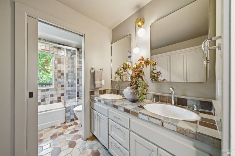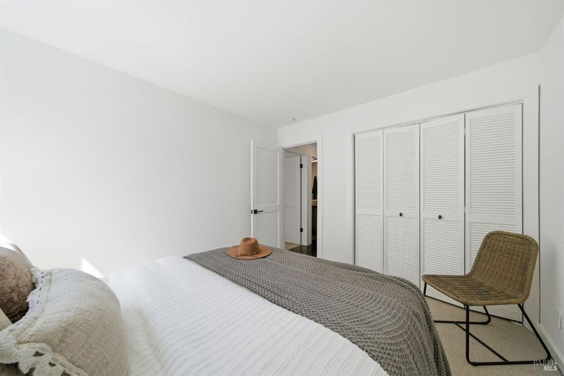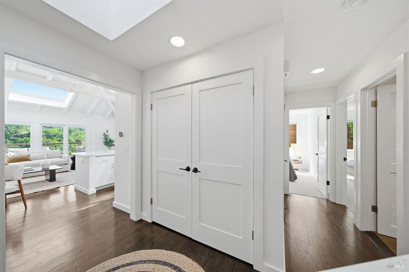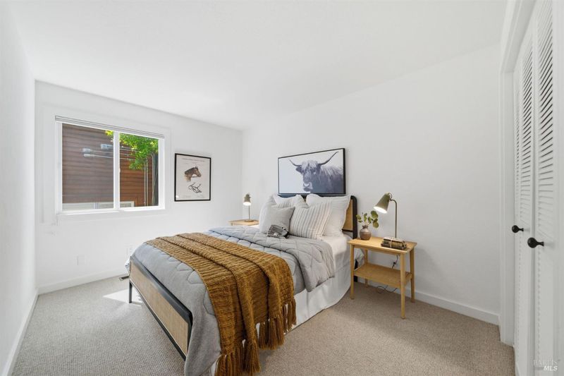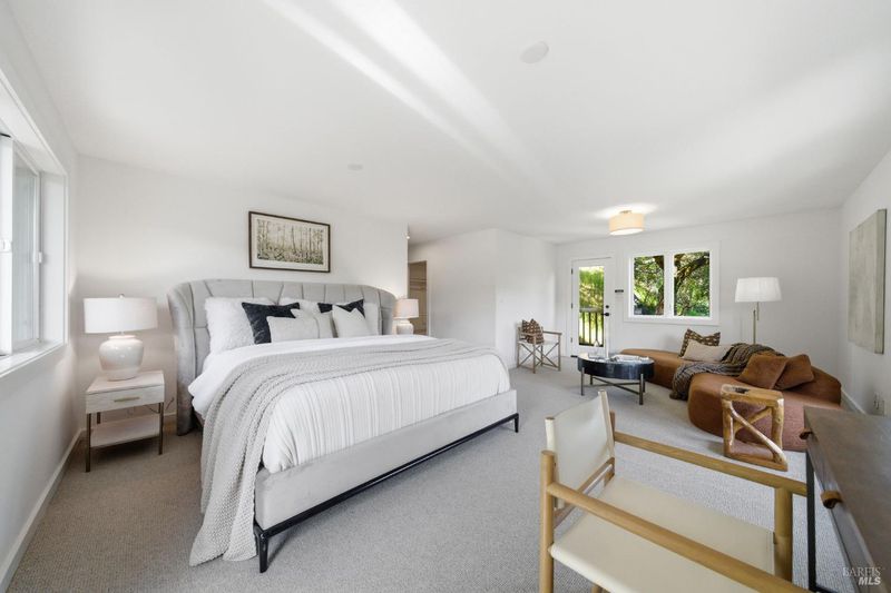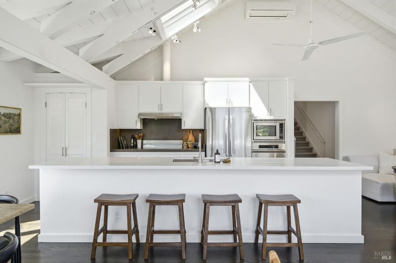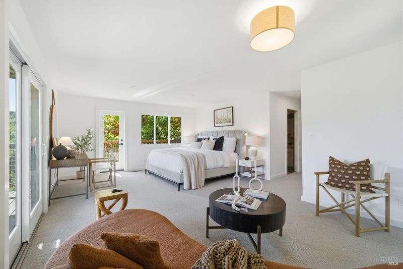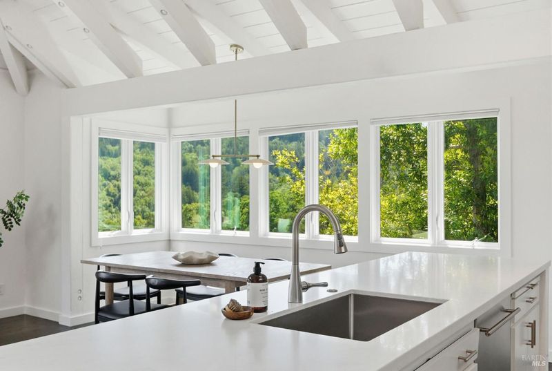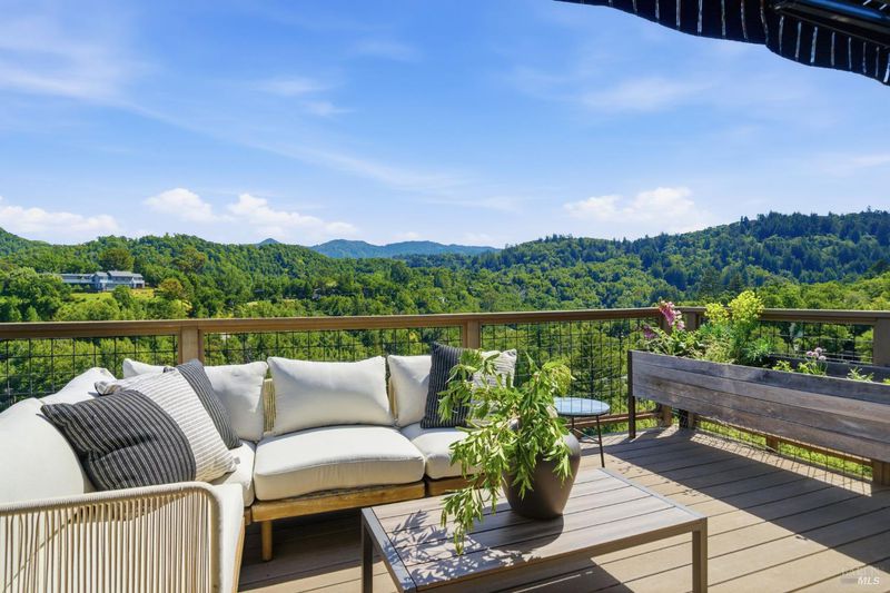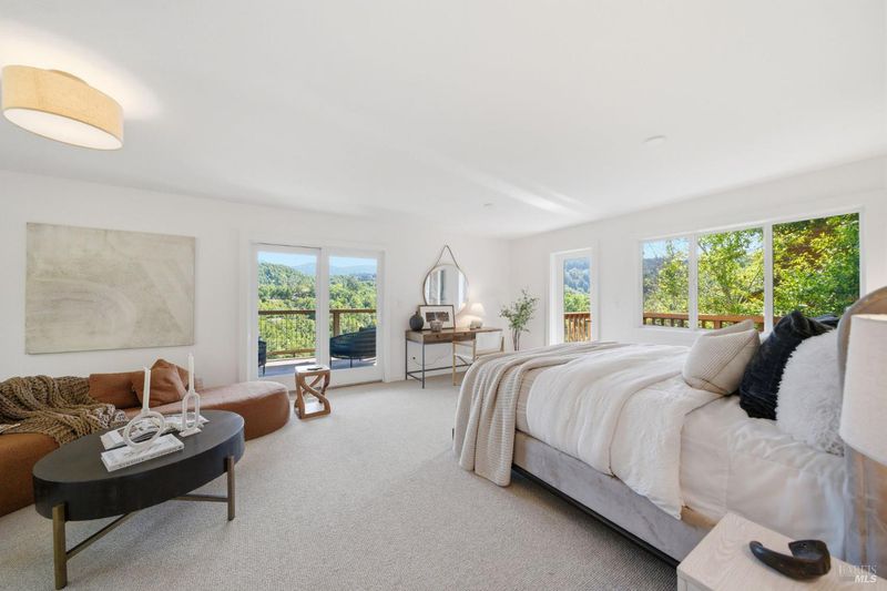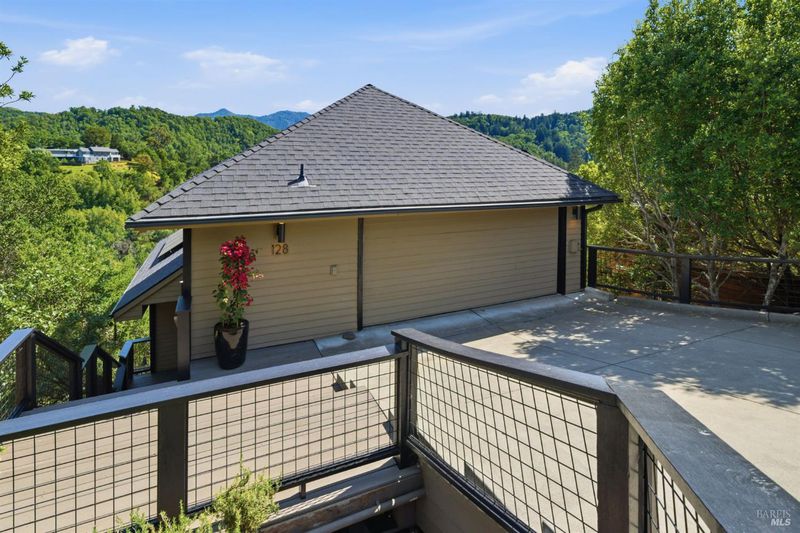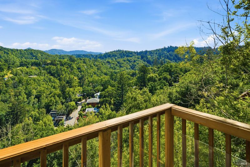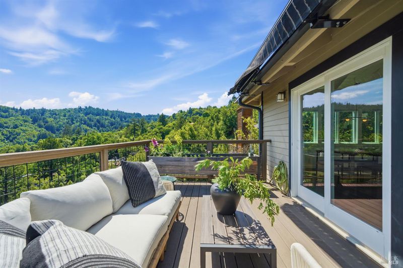 Experience the best of Fairfax living in this sophisticated, modern retreat that perfectly balances serene views with town connectivity. Positioned to capture sweeping vistas and southern light, this 4BR/2BA home blends architectural drama with thoughtful updates so you can ease right in without a big to-do list. The main level boasts soaring exposed-beam ceilings and an open layout designed to frame incredible views. A chef's kitchen serves as the heart of the home, featuring a 12' island, premium appliances (Miele, Bosch, Dacor), and a practical pantry. Two spacious bedrooms and a sleek stone-clad bath complete this floor. Downstairs, the oversized primary suite offers a private sanctuary with a tranquil deck, alongside a laundry room and a versatile 4th bedroom or office. Major systems are thoughtfully updated: roof with heat refective shingles, owned solar, central AC, furnace, + a mini-split for the primary living area all installed within the past ~5 years. Below, a substantial sub-area offers exciting potential for a fitness studio or workshop (Buyers may explore possibilities with the Town). The location is unbeatable: a trail at the end of the street leads you to flat, tree-lined Cypress drive and then just ~.5 mile into downtown Fairfax for dining and music. Alternatively head upward into world-class open space for hiking and biking, all without needing a car. Complete with a 2-car garage, driveway parking, and an adjoining vacant lot for added privacy, 128 Madrone Road is a rare opportunity to move into a quality home project-free and enjoy the quintessential Marin lifestyle.