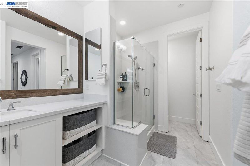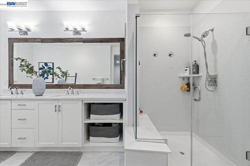 - Shower Over Tub, Solid Surface, Tile, Updated Baths, Double Vanity, Stone