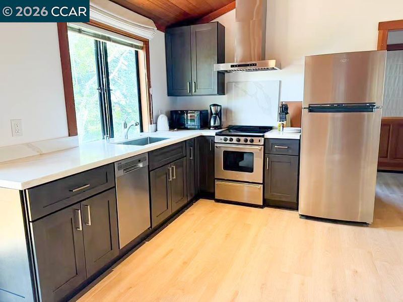 Dishwasher, Electric Range, Refrigerator, Dryer, Washer, Tankless Water Heater, Breakfast Nook, Counter - Solid Surface, Electric Range/Cooktop, Updated Kitchen