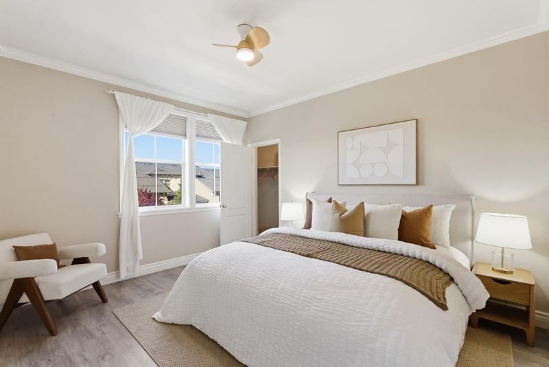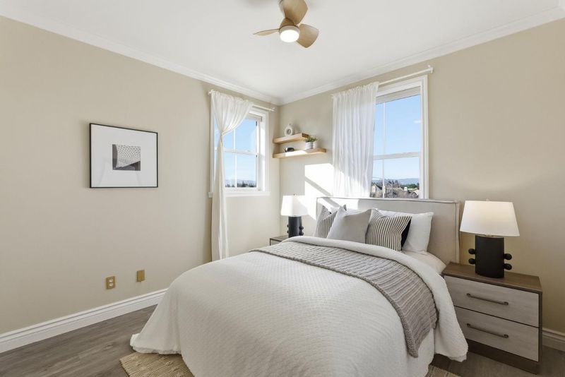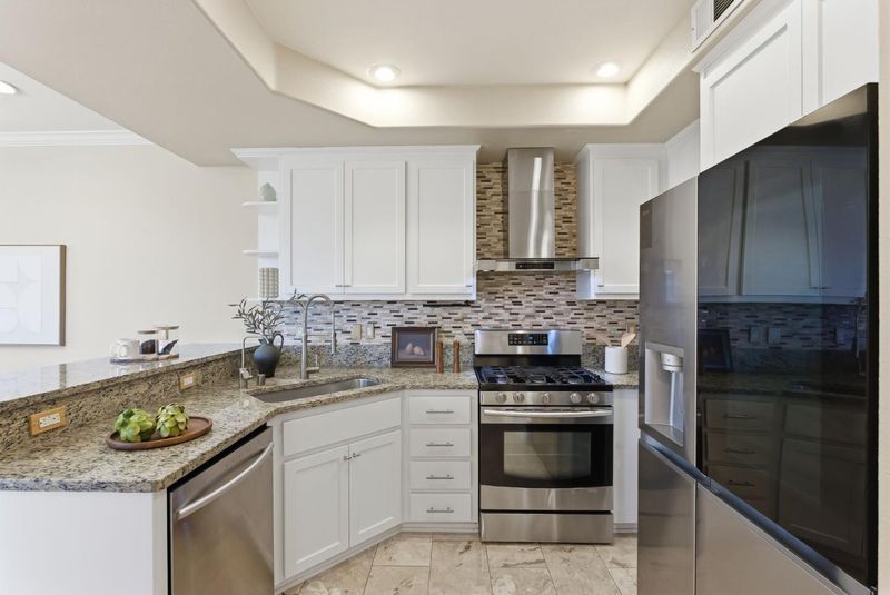 Welcome to this well-loved 2-bed, 2.5-bath townhome in the heart of North San Jose! A beautiful entry welcomes you with a natural stone accent wall and elegant marble flooring. The bright living room is filled with natural light and flows seamlessly into the kitchen and dining area. A large sliding door opens to a spacious patio with spring blooms and peaceful greenbelt views. Customized blinds and soft cotton curtains allow natural light to filter through while maintaining privacy, creating a relaxing Zen-inspired atmosphere complemented by light oak wall shelving. The gourmet kitchen features granite countertops with a full tile backsplash, a breakfast bar, and high-end appliances including a Samsung range oven and dishwasher, LG smart refrigerator, Samsung washer and dryer, and a powerful range hood, perfect for everyday cooking and entertaining. Two bedroom suites are located on the top floor, offering privacy and comfort for both owners and guests. The spacious primary suite includes two walk-in closets and an updated bathroom with double vanities and marble flooring. Prime location within walking distance to Costco, Ranch 99, parks, and golf courses. Close to restaurants, shopping, and easy access to Hwy 880 and 680, with convenient commuting via VTA and BART.