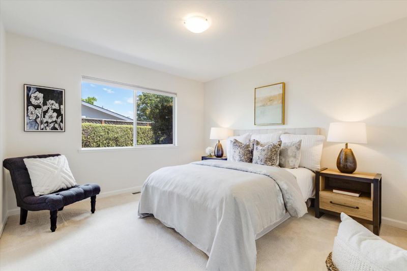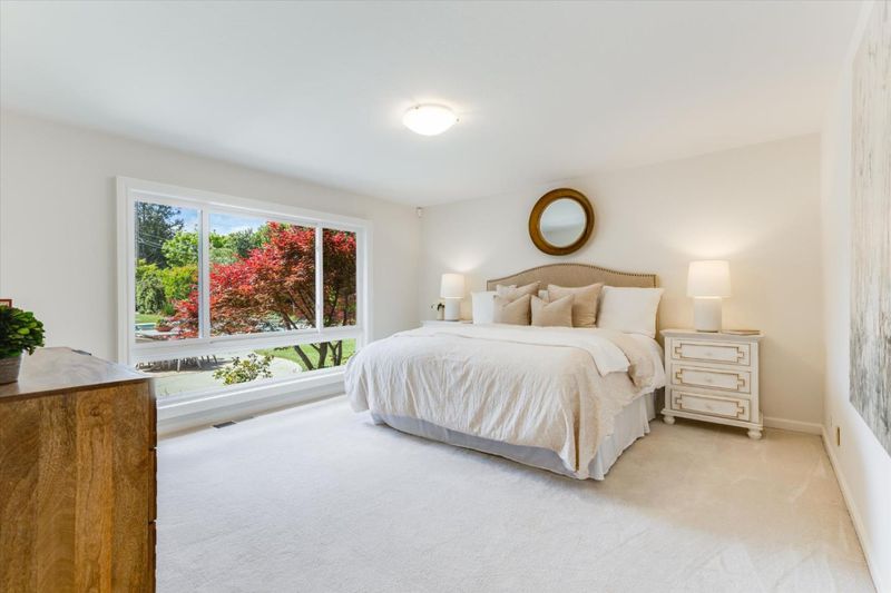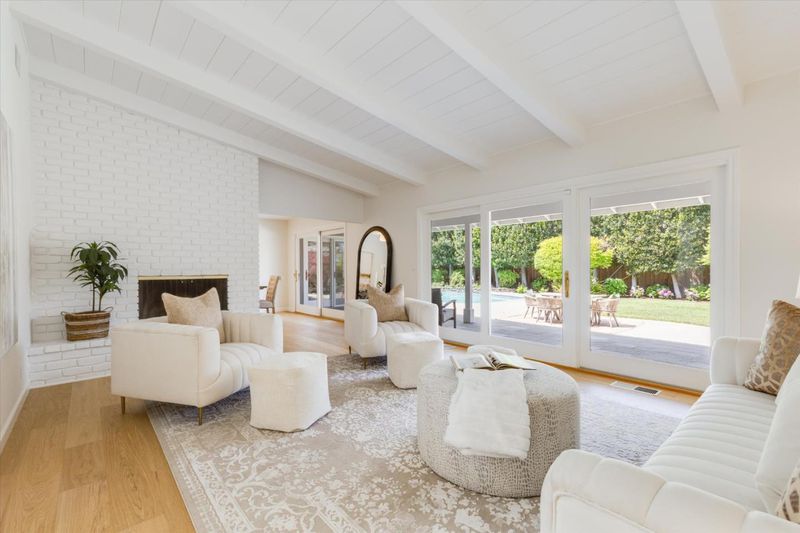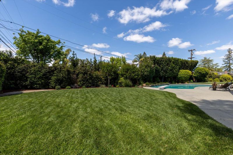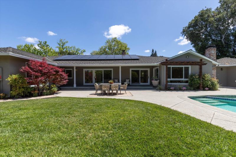 Enjoy living at the enclave of Saratoga Woods in this spacious, 1-story home on a large (17,044+/- sq ft!), sunny lot. Connect with neighbors walking the quiet streets, or meeting at Saratoga Woods Swim/Social Club($700 to join, $1,020 dues). Stone-tiled entry with skylight, & new, European Oak engineered hardwood in the living areas. Lovely kitchen offers white cabinetry, 3 large windows, new 6-burner range, double ovens, dishwasher, & disposal. Family room opens from the kitchen, has a high wood ceiling, fireplace with gas log, & large window & French door viewing the rear yard & patio, Primary bedroom retreat located at the rear of the home, has a new sliding French door leading to rear yard pool/spa, & two closets. Bedroom wing offers 3 more bedrooms, & hall bath with dual-sink vanity, shower-over-tub with clear glass enclosure. Fifth bedroom currently used as office has new French doors. Huge, private rear yard oasis has pool with spa, covered porch with Connecticut Bluestone tile, 2 large grass areas, & lemon, orange, & Meyer lemon fruit trees. Other valuable features: AT&T high speed fiber connection, solar electric system, composition shingle roof, dual pane windows, central air conditioning, refrigerated 1200-bottle wine closet, recessed lighting, 2-car garage.
