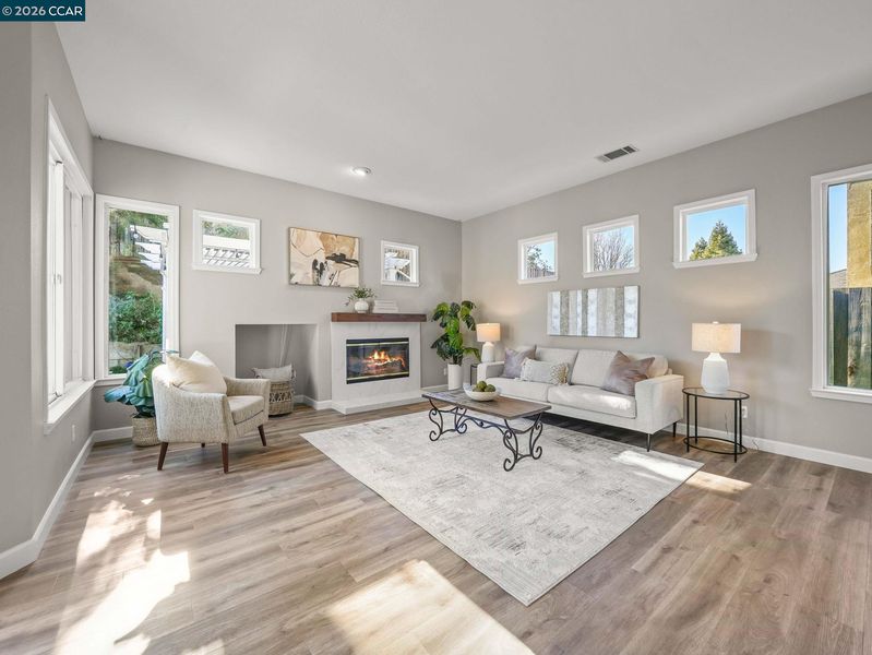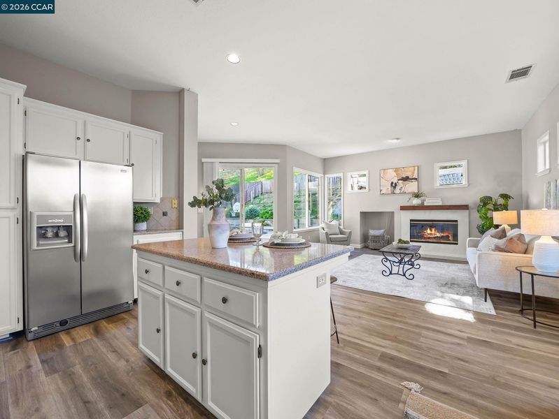 Sprawling single story tucked away on a cul-de-sac backing to open space! Upgraded Vinyl "wood plank look" flooring and new neutral carpet throughout! New HAVC unit, neutral paint and updated baths! Huge reconfigured combined dining and living room with sunny windows, recessed & upgraded lighting and a drybar with glass display cabinets. Gourmet kitchen with slab solid surface counter, island and full decorative tile backsplash! Stainless steel appliances and large sun filled window with garden ledge opens to the adjacent family room offering a cozy wood burning fireplace with solid slab surround, raised hearth & wood mantle. Private & spacious primary suite features a wood burning fireplace and slider to patio. Updated primary bathroom boasts an oversized stall shower with solid slab surround & glass enclosure, vanity with dual sinks and a separate make-up vanity and a large walk-in closet. Private rear yard backs to oak dotted open space and features an in-ground freeform pebble tech pool & spa