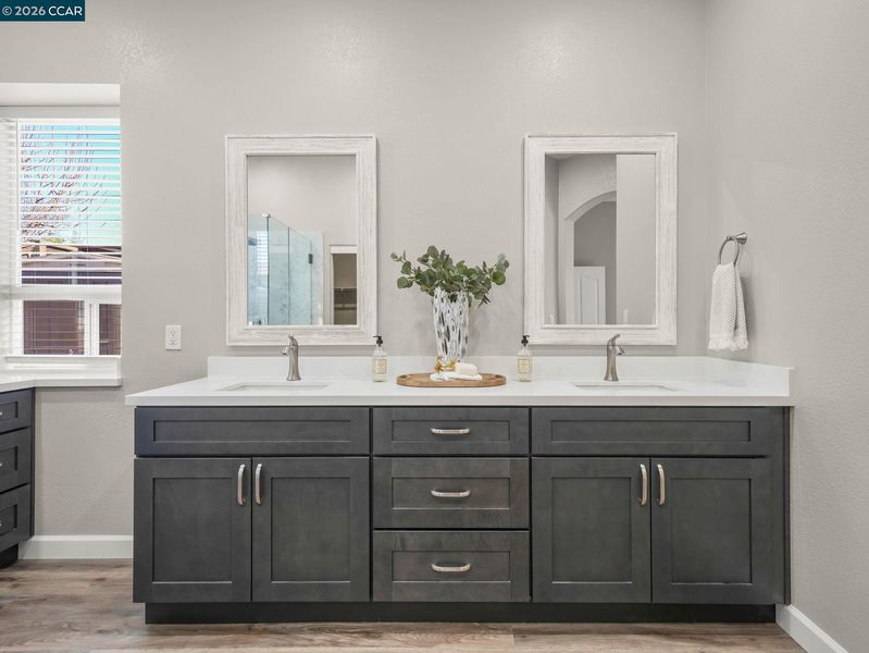 - Shower Over Tub, Solid Surface, Updated Baths, Double Vanity