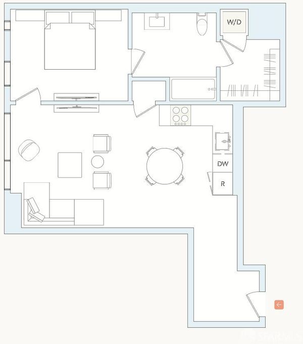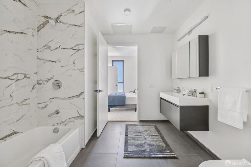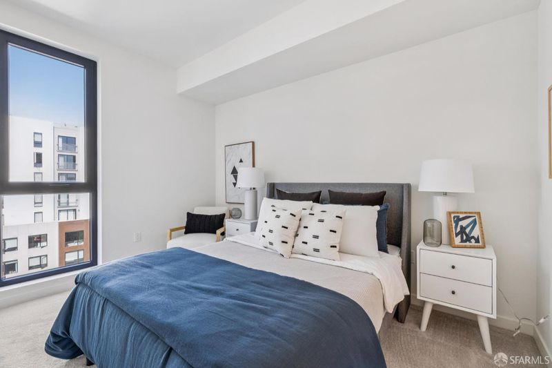 One-bedroom residence with oversized walk-in closet positioned within the quiet interior of the building. Windows feature double-pane glass for enhanced sound insulation, creating a peaceful interior setting. The open layout is finished with quartz countertops, white oak flooring, and a contemporary kitchen equipped with a gas range and integrated Bosch dishwasher. An additional storage closet adds everyday flexibility, and central air conditioning and heating provide year-round comfort. Residents enjoy an attended lobby and a rooftop terrace with panoramic city views, seating areas, outdoor grills, and a dedicated dog relief area. Secure bicycle storage and smart entry via the Latch system complete this thoughtfully designed home.