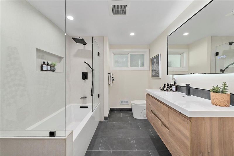 - Bidet, Double Sinks, Stall Shower, Skylight, Tile, Tub in Primary Bedroom, Updated Bath, Oversized Tub