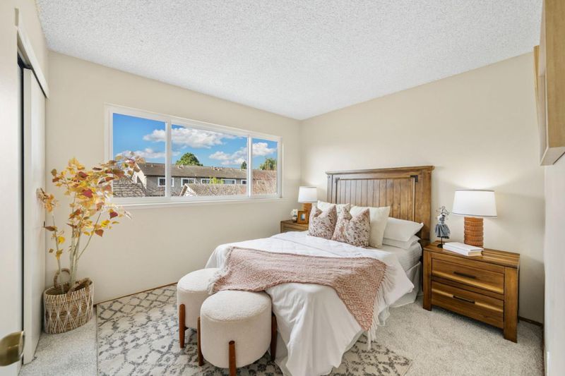 Across from the shoreline, this inviting two-story townhouse captures the essence of coastal living with walkable access to the Bay Trail, downtown shops and dining, and the beach just moments away. The main level offers a bright, welcoming living room centered around an electric fireplace, a versatile double-door office enclosure ideal for working from home, an adjacent half bath, and a seamless flow that connects the living and dining spaces. The updated kitchen features modern finishes, ample cabinetry, and sliding glass doors that open to a private outdoor patio, perfect for relaxing or entertaining, with convenient access to the laundry area. Upstairs, a spacious bathroom highlights a glass-enclosed shower with designer tile detailing. The primary bedroom enjoys serene Bay views, while additional bedrooms are filled with natural light and flexible living options. A detached two-car garage provides valuable storage and parking. Last but not least, don't miss the community pool and clubhouse!