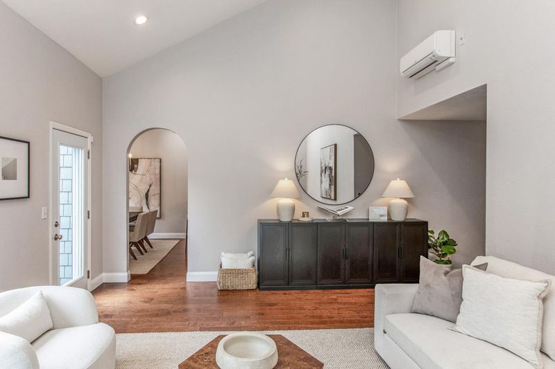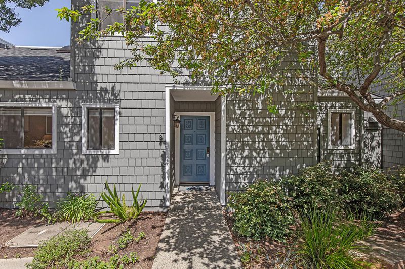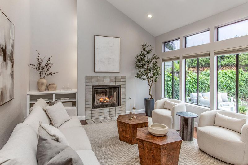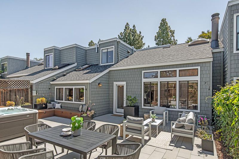 Enjoy lofty ceilings, a functional floor plan, numerous skylights, and a light and bright atmosphere in this updated two-story townhome. The living room has soaring vaulted ceilings, a focal-point fireplace, and tall windows overlooking the yard. Sitting between the living room and the kitchen for easy entertaining, the dining room is illuminated by large windows. The kitchen features abundant cabinetry, stunning white quartz countertops, elevated bar seating, and a large pantry. The primary suite features high ceilings, three large closets, and a beautifully updated en suite bath. Upstairs, you have two well-sized bedrooms with easy access to the hall bathroom. For alfresco enjoyment, you have a large concrete paver stone patio and hot tub surrounded by mature plantings, a raised garden bed, and sleek planters. Detached one-car garage, plus ample guest parking. Located in the desirable Los Arboles community with a pool and well-maintained grounds. Steps to Gemello Park, and close to shopping, dining, commute routes, and both downtown Mountain View and Los Altos.
