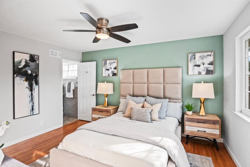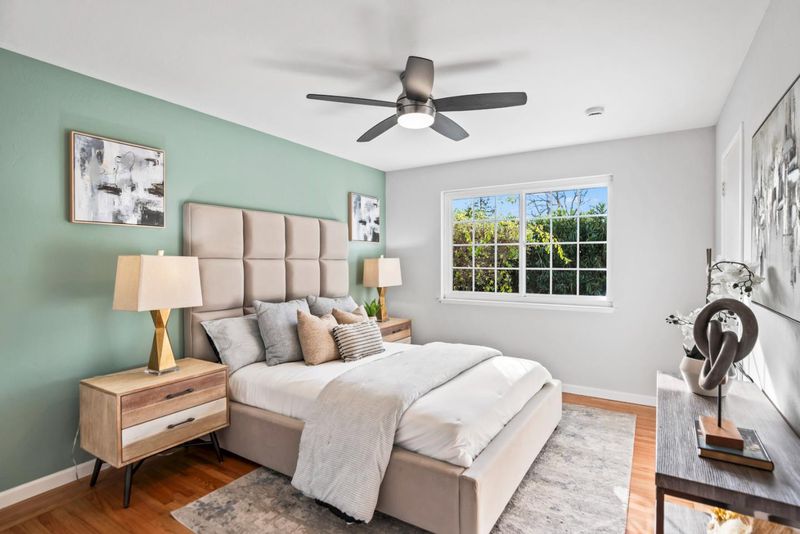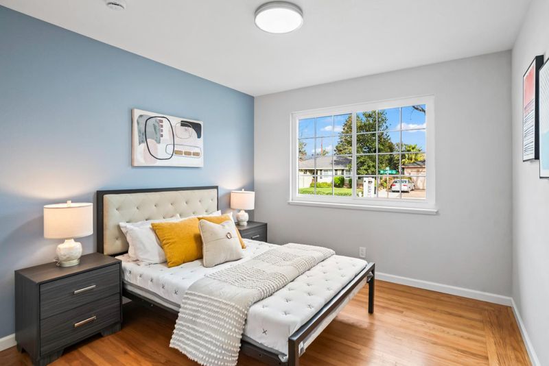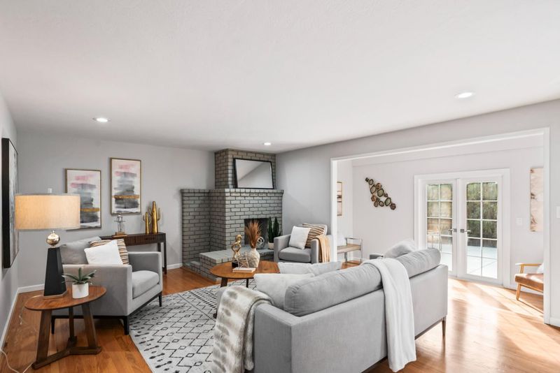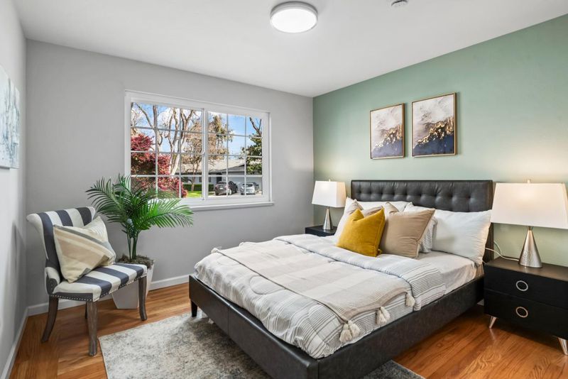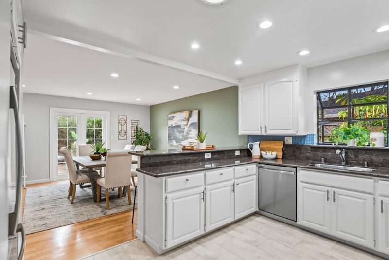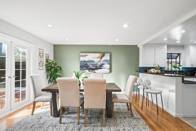 Modern comfort & spacious living on large corner lot just 0.8 miles to the Apple Spaceship Campus! You'll love the open-concept layout & a kitchen that shines with beautiful cat-eye granite counters, blue tile backsplash, peninsula with seating, LVT flooring, & bright box bay window overlooking lush plants. There's a large dining room; cozy living room with fireplace; & bonus space off the living room ideal for additional seating, dedicated playroom, or hobbies! Two sets of elegant French doors open to the inviting backyard with a wood deck & paved seating area perfect for entertaining or relaxing in the Bay Area's desirable year-round weather. Glistening hardwood floors, two sun tunnels, & designer-selected interior paint fill the home with natural light. Plus, updated bathrooms feature fresh white cabinets & modern fixtures, & the garage has lofted storage & practical workbench for extra convenience. Enjoy a prime Silicon Valley location in this quiet neighborhood close to major tech employers, commuter routes, scenic parks including just 1.5 miles to the 52-acre Central Park with pickleball courts, delicious restaurants, & high-end amenities. Students have access to excellent schools in Laurelwood Elementary, Peterson Middle, & Wilcox High (buyer to verify)!