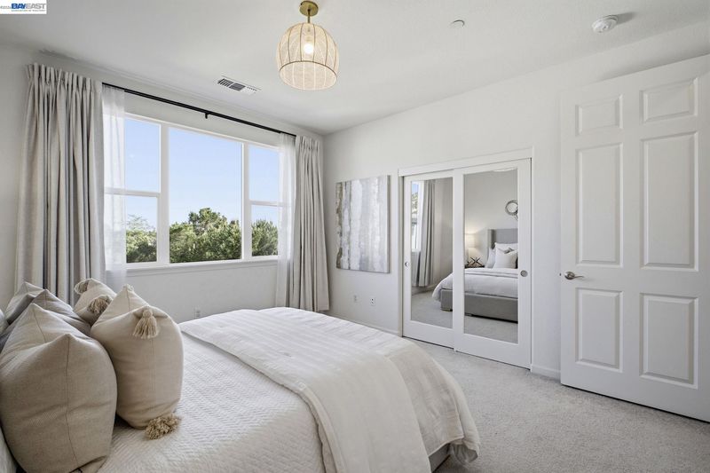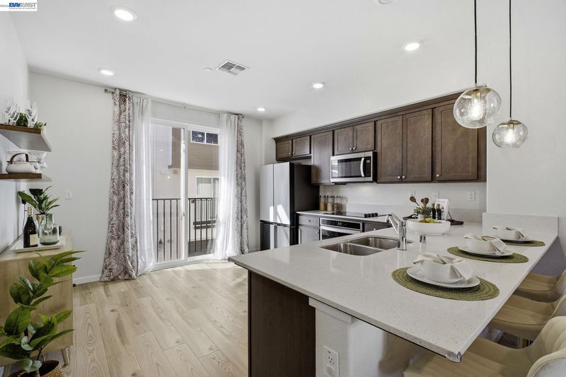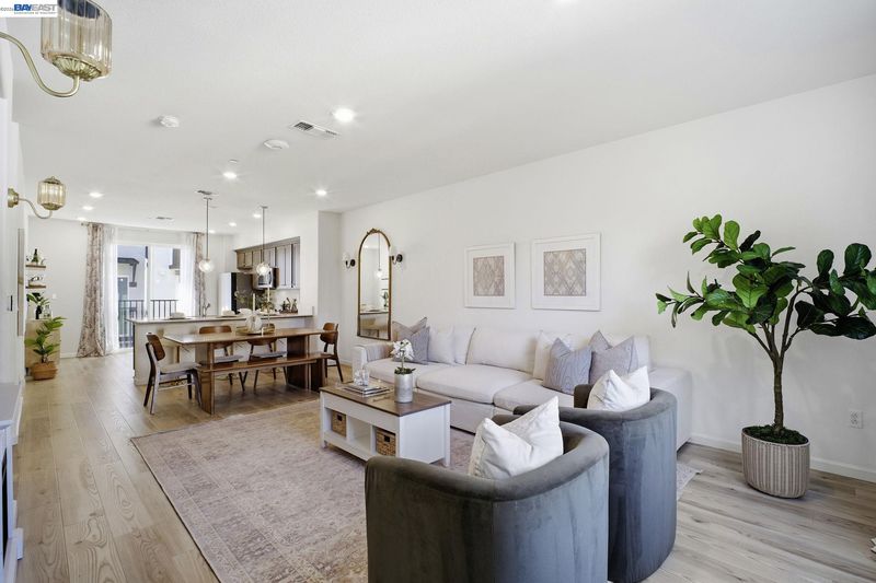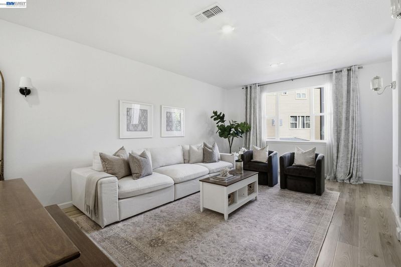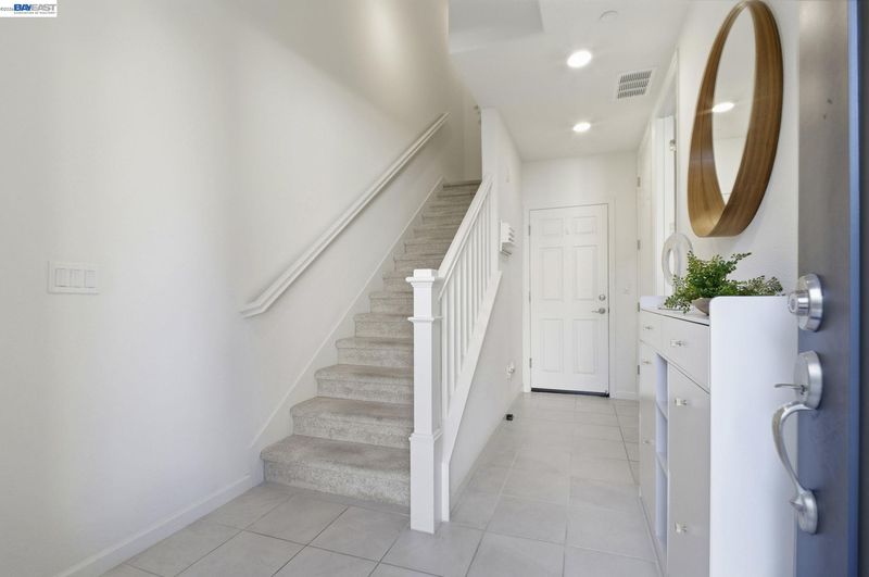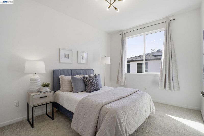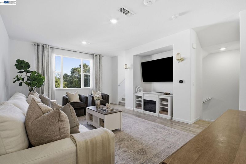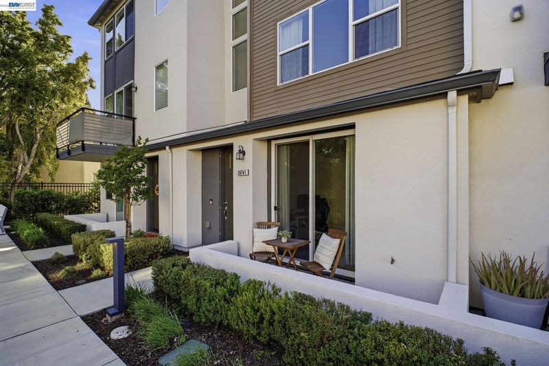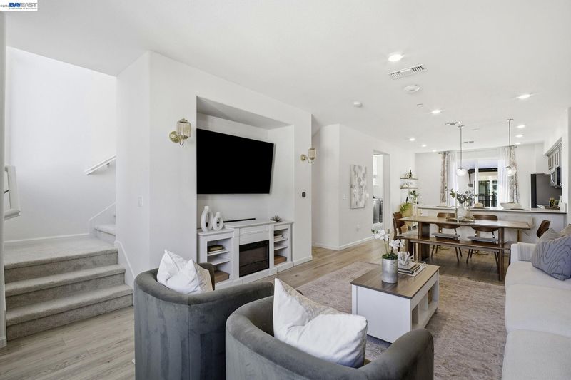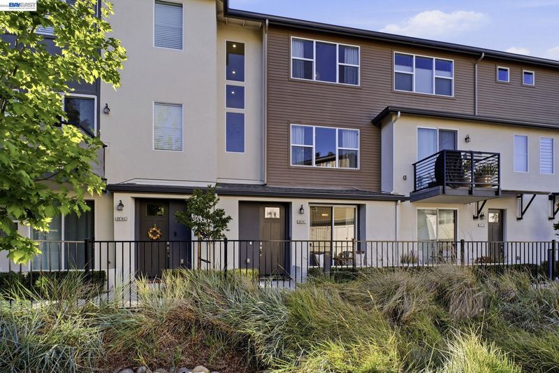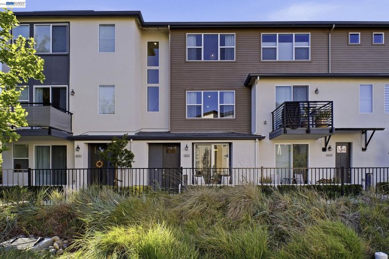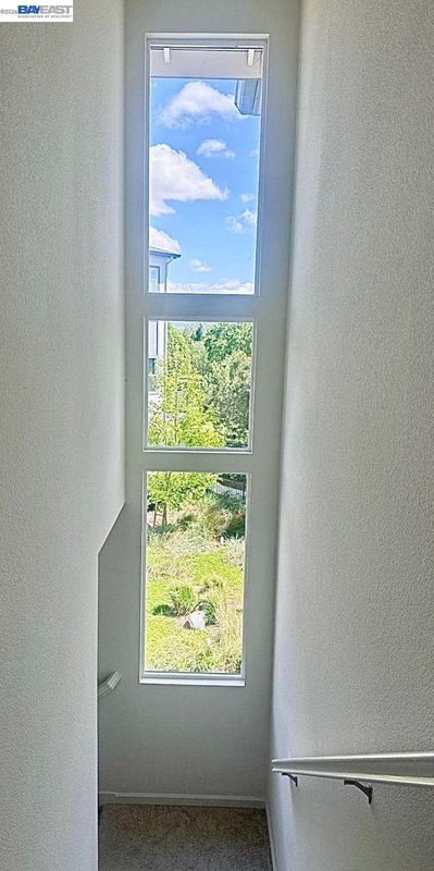 Tucked away in a quiet interior location, this beautifully updated 4BD/3.5BA townhome offers 1,892 sq ft of bright, modern living with partial golf course views. Built in 2022, this energy-efficient home features an open-concept main level with kitchen, dining, living area, and a convenient half bath. Natural light flows throughout, highlighted by large living room windows and a striking floor-to-ceiling stairway window that adds architectural character and an airy feel. The first level includes a private bedroom with en-suite bath and access to its own outdoor space—perfect for a reading nook or mini garden. Upstairs, the primary suite features abundant light, treetop views, a large closet, and en-suite bath with dual sinks and a spacious shower, plus two additional bedrooms and a full bath. Additional highlights include owned solar and multi-level heating and A/C for enhanced comfort and efficiency. Enjoy a peaceful community with BBQ area and playground, just minutes from BART, I-880, Hwy 92, shopping, dining, and everyday essentials—including Starbucks steps away.