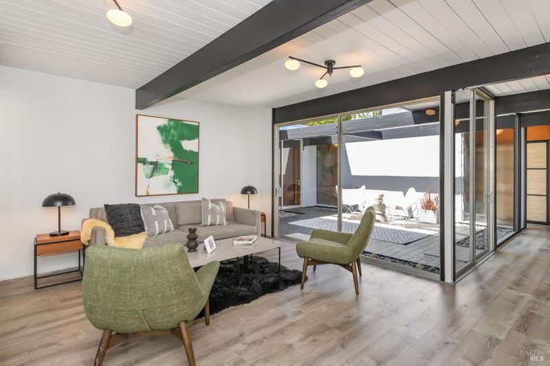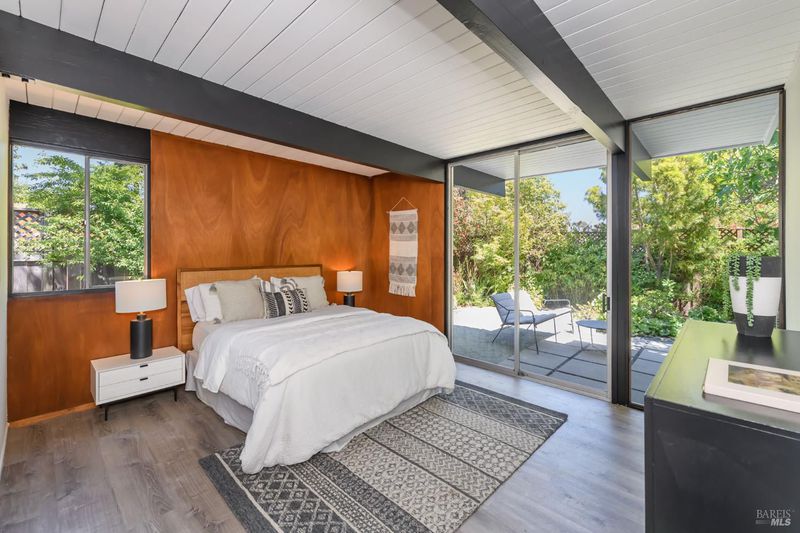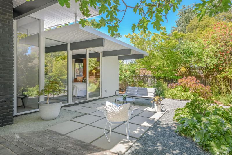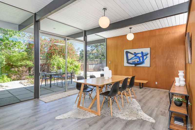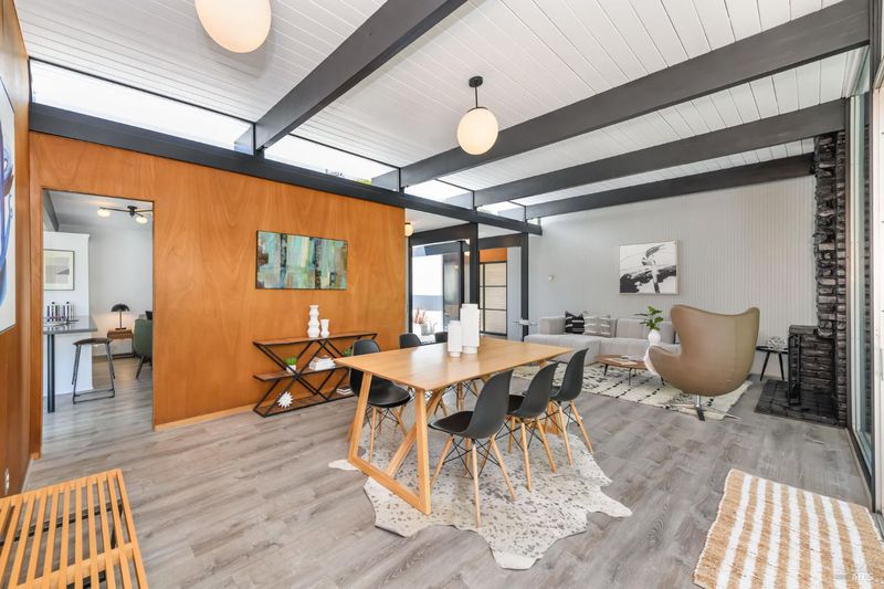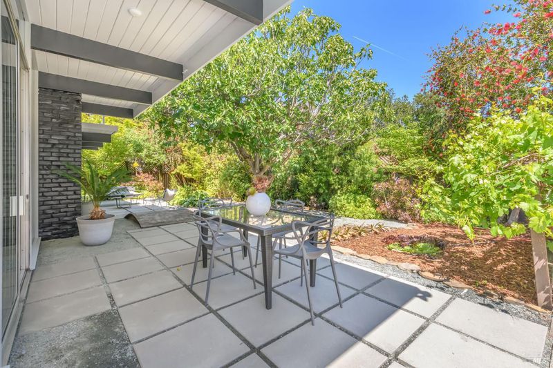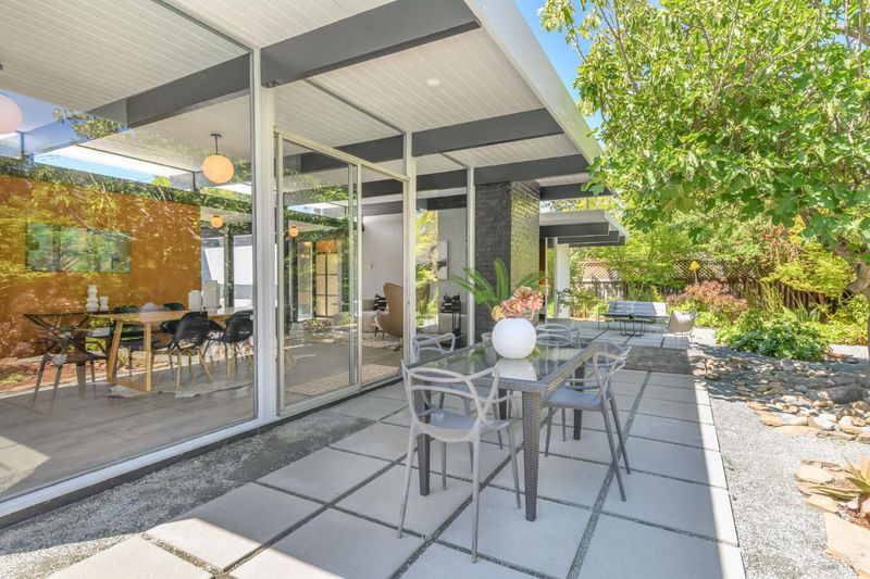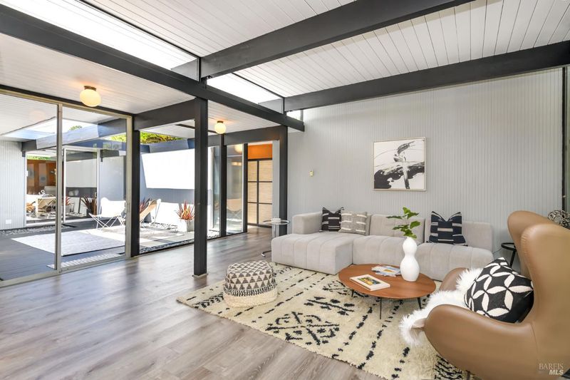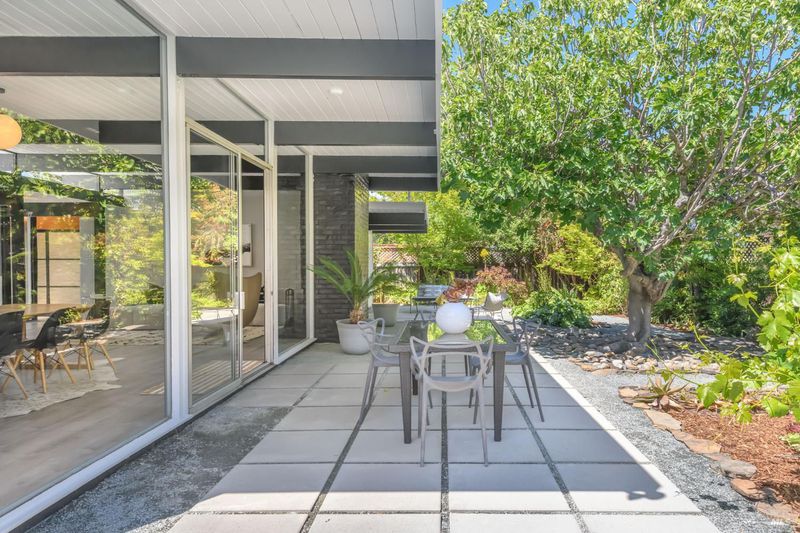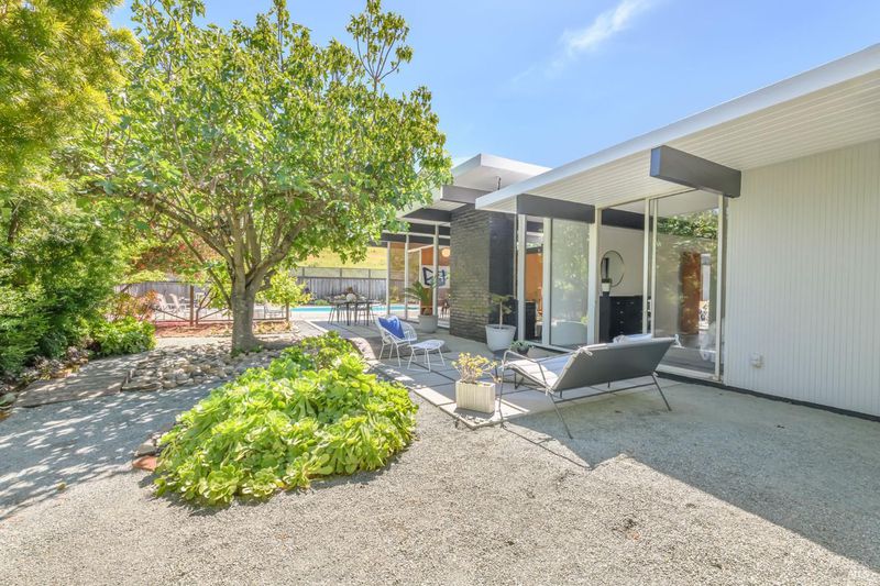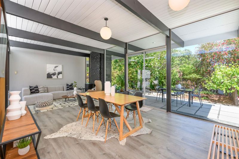 Stunning center-atrium Eichler featuring soaring 10-foot ceilings in the living and dining areas. This highly desirable floor plan offers 4 bedrooms and 2 bathrooms with seamless, single-level living and effortless flow from room to room. Floor-to-ceiling windows guide you through the home and out to the backyard, while the sunlit central atrium and transom windows fill the space with natural light throughout the day. The open-concept kitchen is beautifully updated with new quartz countertops, an extended peninsula with seating, a new stainless steel French-door refrigerator, and a new oven. The bedrooms and main living areas strike the perfect balance of classic Eichler style and modern comfort, showcasing signature mahogany paneling alongside fresh, contemporary finishes. Step outside to a thoughtfully landscaped backyard featuring a new paver patio, a large pool, surrounded by lush greenery, succulents, mature landscaping, and the privacy of backing to open space. The home also includes a well-functioning radiant heating system and a spacious two-car side-by-side garage, offering comfort and convenience. Ideally located near Northgate shopping, close proximityto transportation, the Civic Center Farmers Market, and more. This home delivers the best of mid-century design and modern living.