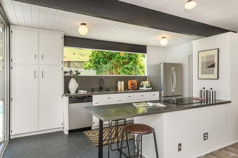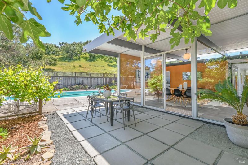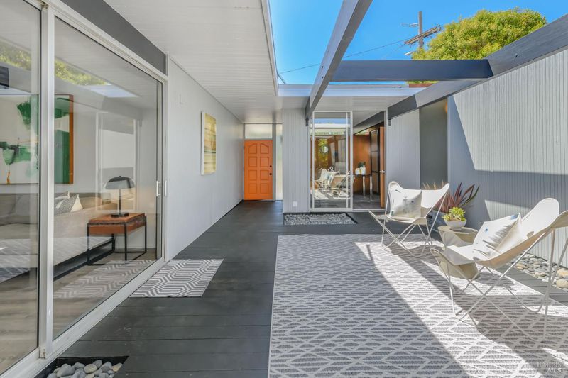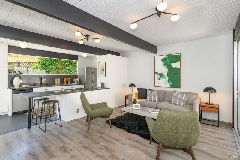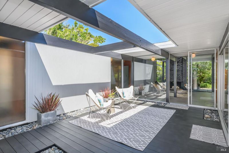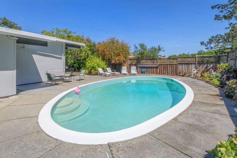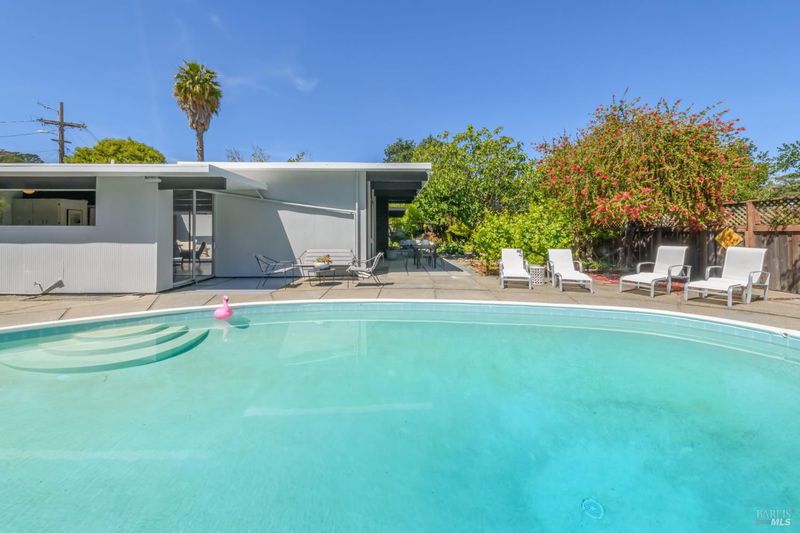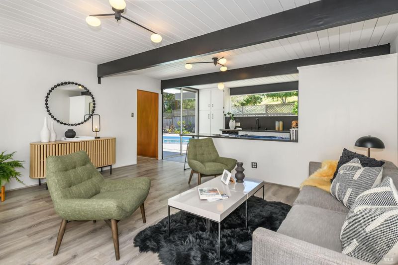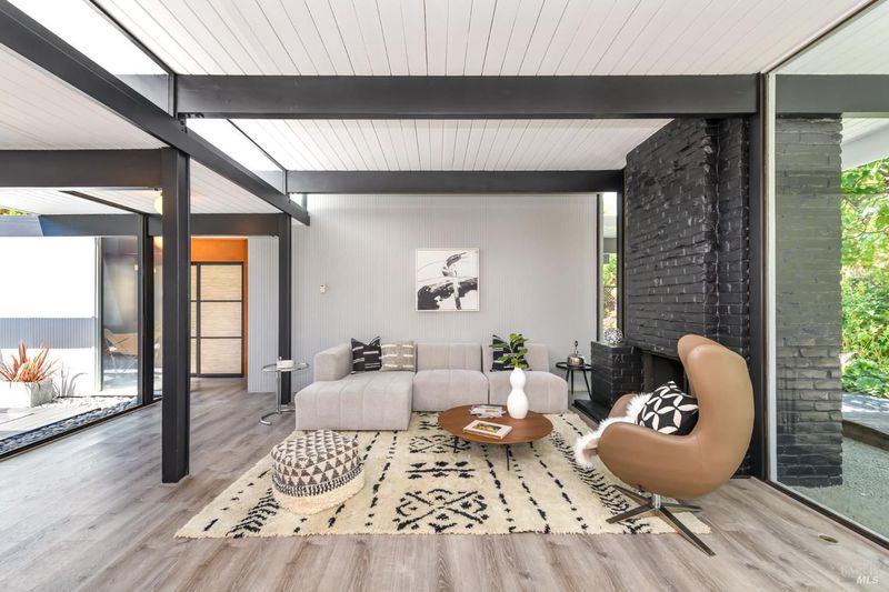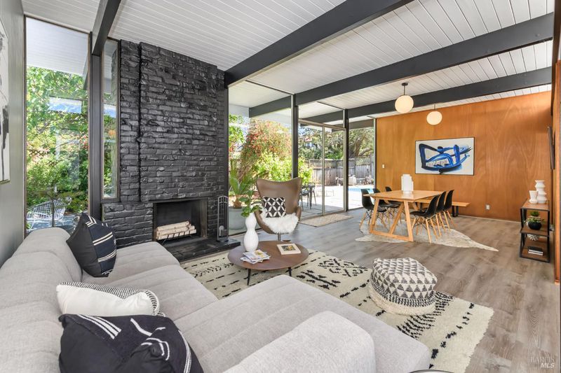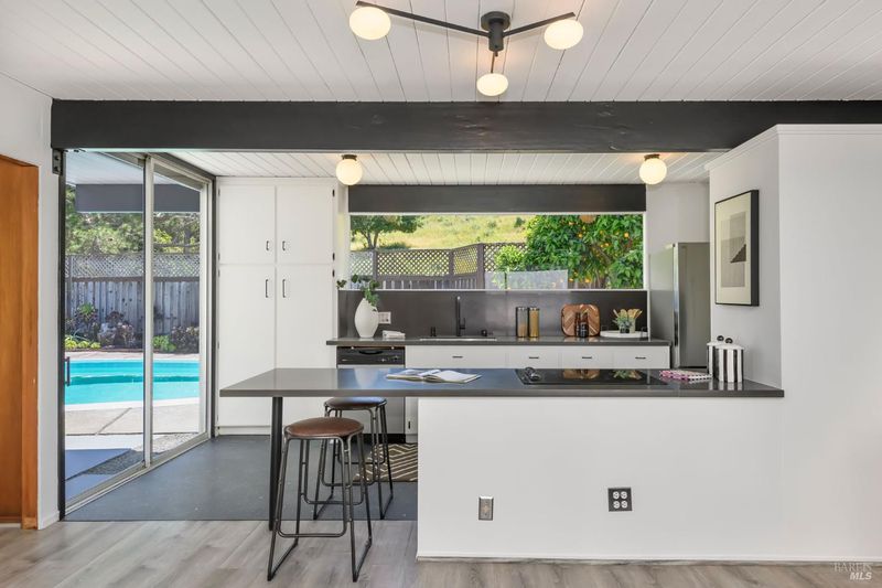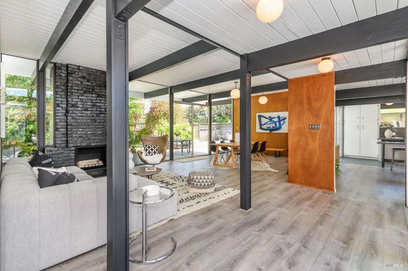 Stunning center-atrium Eichler featuring soaring 10-foot ceilings in the living and dining areas. This highly desirable floor plan offers 4 bedrooms and 2 bathrooms with seamless, single-level living and effortless flow from room to room. Floor-to-ceiling windows guide you through the home and out to the backyard, while the sunlit central atrium and transom windows fill the space with natural light throughout the day. The open-concept kitchen is beautifully updated with new quartz countertops, an extended peninsula with seating, a new stainless steel French-door refrigerator, and a new oven. The bedrooms and main living areas strike the perfect balance of classic Eichler style and modern comfort, showcasing signature mahogany paneling alongside fresh, contemporary finishes. Step outside to a thoughtfully landscaped backyard featuring a new paver patio, a large pool, surrounded by lush greenery, succulents, mature landscaping, and the privacy of backing to open space. The home also includes a well-functioning radiant heating system and a spacious two-car side-by-side garage, offering comfort and convenience. Ideally located near Northgate shopping, close proximityto transportation, the Civic Center Farmers Market, and more. This home delivers the best of mid-century design and modern living.