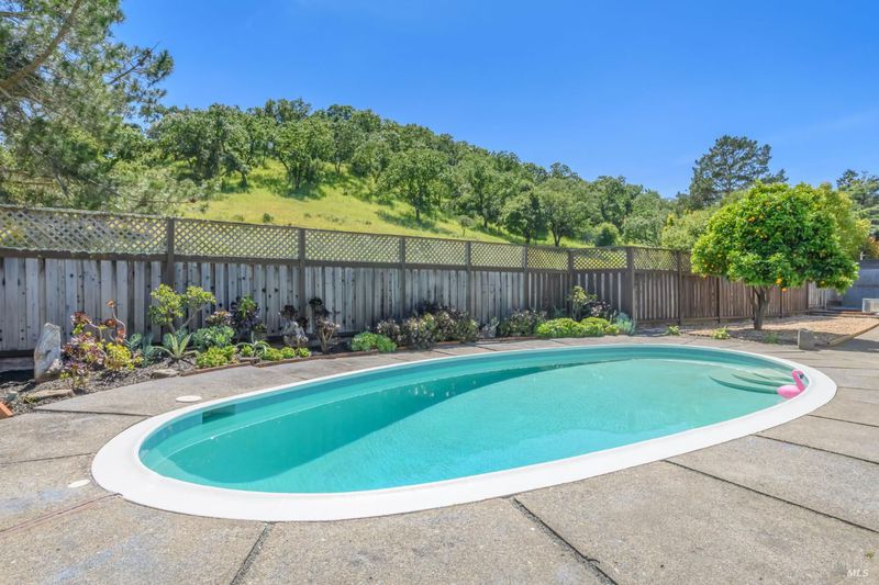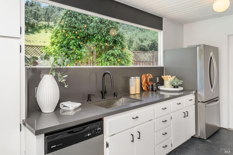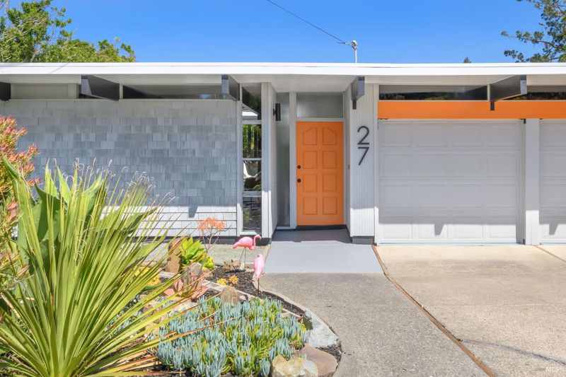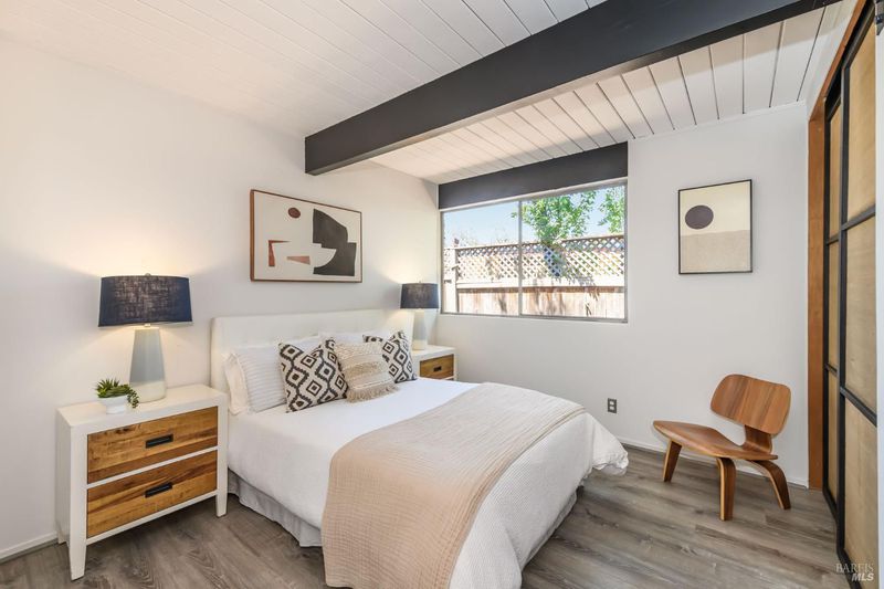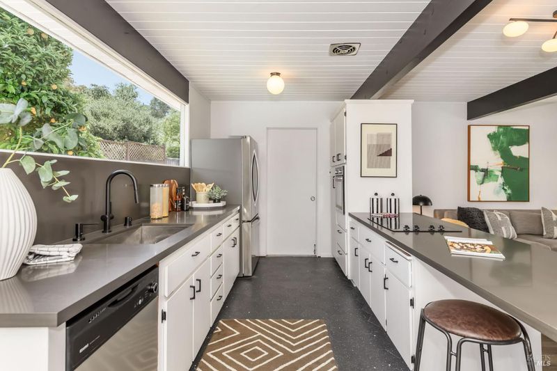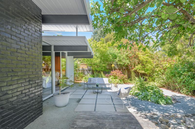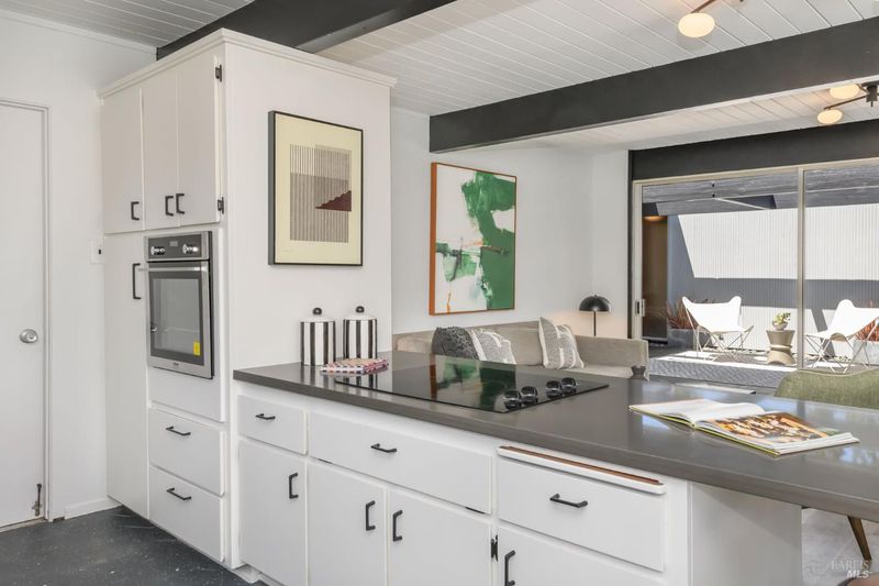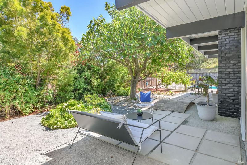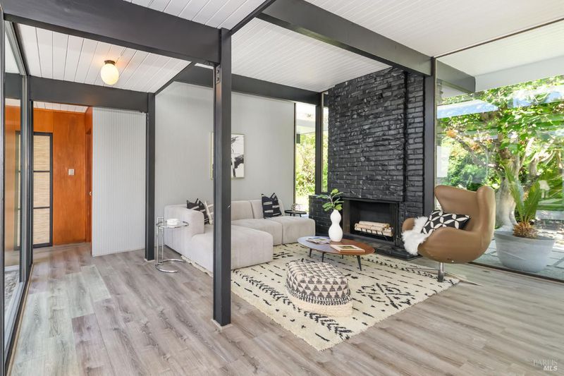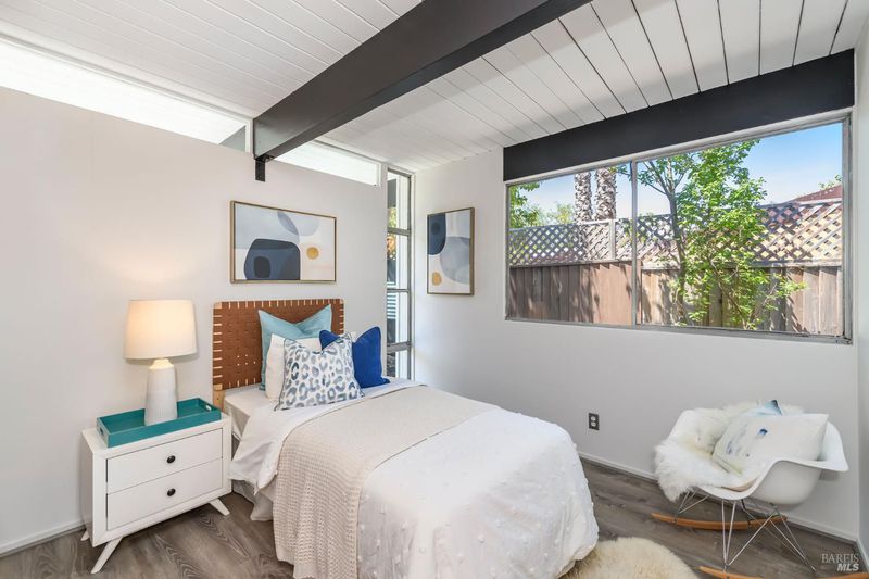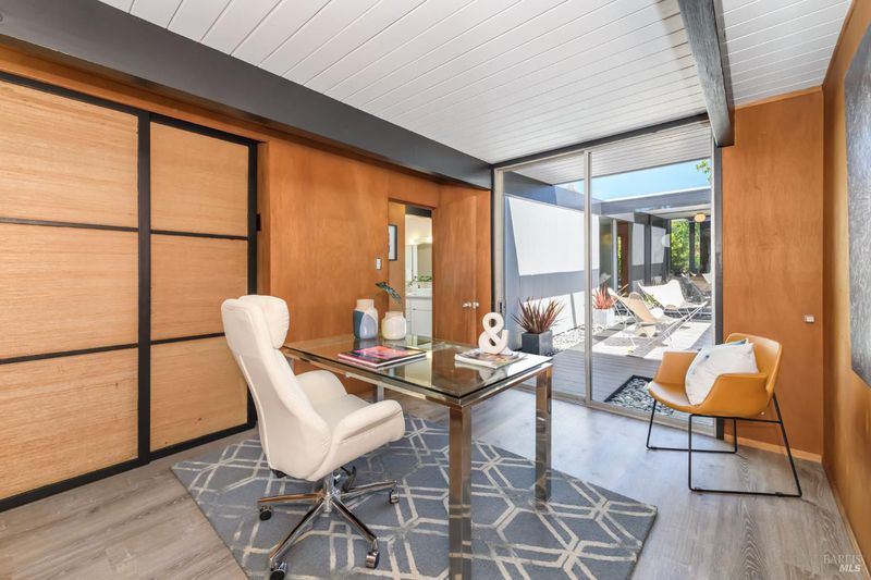 Stunning center-atrium Eichler featuring soaring 10-foot ceilings in the living and dining areas. This highly desirable floor plan offers 4 bedrooms and 2 bathrooms with seamless, single-level living and effortless flow from room to room. Floor-to-ceiling windows guide you through the home and out to the backyard, while the sunlit central atrium and transom windows fill the space with natural light throughout the day. The open-concept kitchen is beautifully updated with new quartz countertops, an extended peninsula with seating, a new stainless steel French-door refrigerator, and a new oven. The bedrooms and main living areas strike the perfect balance of classic Eichler style and modern comfort, showcasing signature mahogany paneling alongside fresh, contemporary finishes. Step outside to a thoughtfully landscaped backyard featuring a new paver patio, a large pool, surrounded by lush greenery, succulents, mature landscaping, and the privacy of backing to open space. The home also includes a well-functioning radiant heating system and a spacious two-car side-by-side garage, offering comfort and convenience. Ideally located near Northgate shopping, close proximityto transportation, the Civic Center Farmers Market, and more. This home delivers the best of mid-century design and modern living.