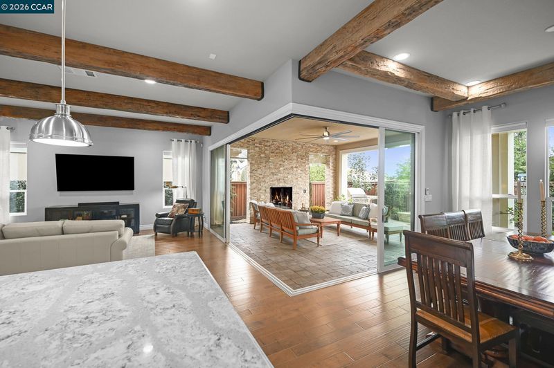 55+ Resort Living in Trilogy. Enter the Property through the Arched, Private Custom Wrought Iron Gate into the Private Front Patio Area with a Soothing Water Feature. Upgraded Glass & Decorator Iron Decor Front Door Opens to the Extensive Hardwood Floors Throughout Except Bedrooms. Den/Office with Built-in Cabinets, Shelves & Lights. Gorgeous Hardwood Floors with Rustic Wood Beam Accents in the Great Room and Formal Dining Room That Holds a Large Table & Buffet, Gorgeous Kitchen w/Wide Quartz Counters, Backsplash, Built-in Refrig., GE Monogram Appliances, Swiss Coffee White Color Upgraded Cabinets Throughout & 2 Spacious Pantries. Laundry Rm. w/Washer & Dryer, Cabinets, Sink & Utility Closet. Lg. Primary Suite w/Dual Sink Areas, Full Decorator Tile Accented Shower, Dual Closets & Upgraded Light Fixtures. Guest Bedrm Suite, Extended Builder Patio Overhang w/Fireplace, Stacked Stone Walls, Lg. Water Fountain, Built-in BBQ/Refrig., Lovely Landscaping w/Faux Grass Area too. 3 Car Tandem Garage w/Epoxy Floor & Built-in Cabinets. Gorgeous Clubhouse, Cafe, Indoor & Outdoor Pools, Spa & Gym Building, Event Center, On-Site & Off-Site Activities & so Much More. 20 Yr. Builder Pre-Paid Solar Lease, Balance of Term to be Transferred to Buyer