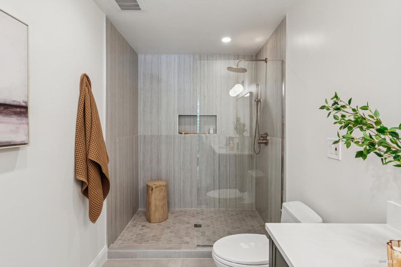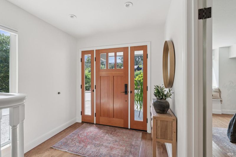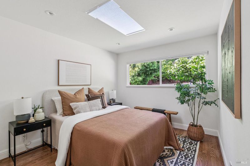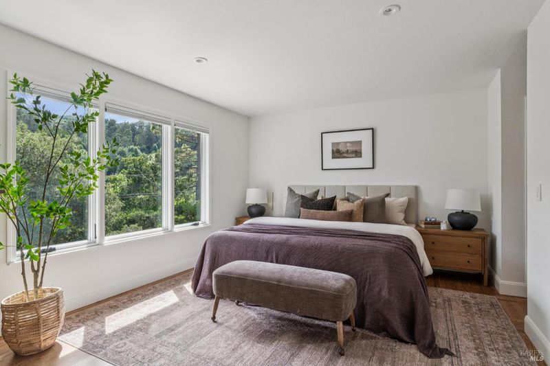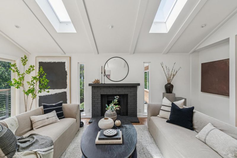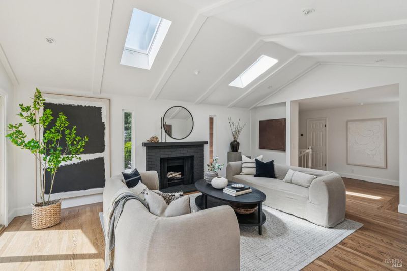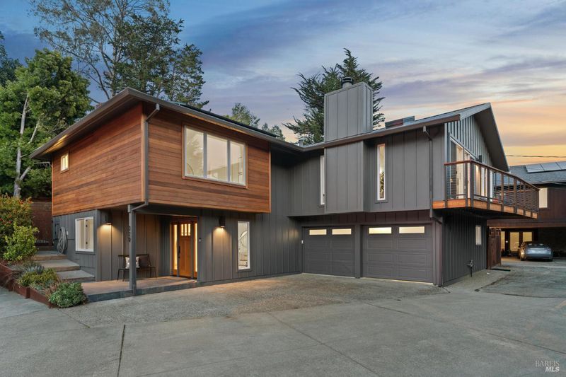 Located in the highly sought-after Homestead Valley, this beautifully updated home offers an open, airy atmosphere with vaulted ceilings and an abundance of natural light. The spacious family room flows seamlessly into a large, flat backyard - a rare find in Mill Valley - perfect for outdoor gatherings, playtime, or relaxing mornings. The main level features three generously sized bedrooms, ideal for families seeking both connection and privacy. Downstairs, a large en suite bedroom offers flexibility as a guest retreat, home office, or playroom. The home has been thoughtfully upgraded with high-end finishes throughout. Brand-new Hardiplank and cedar siding add style and durability, while fully remodeled bathrooms feature elegant, spa-like details. The upgraded kitchen, complete with a commercial-grade Wolf range, is perfect for hosting or meal prep. Custom built-ins in the dining room offer both sophistication and function, and hardwood floors throughout create a warm, inviting atmosphere. Additional highlights include a large attached garage with a solar energy storage system, a new metal roof, and solar panels, combining modern efficiency with sustainability.